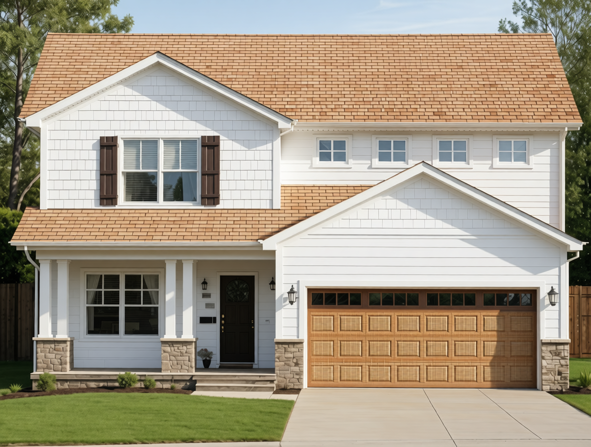 keep the everything the same change only the lap siding to white and the shakes above the porch to wicker and shakes above the garage to wicker