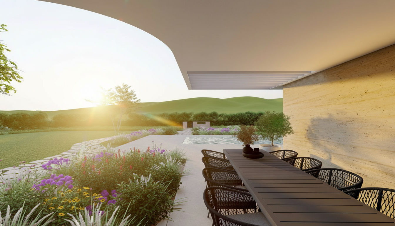 grainy watercolor render of craftsman style farmhouse with timber accent and white horizontal lap wood siding and stone wainscot watercolor trees and north dakota prairie environment in the background sitting at the base of a large rolling hill taller than the house and extensive natural watercolor landscaping surrounding the building keep the house as is