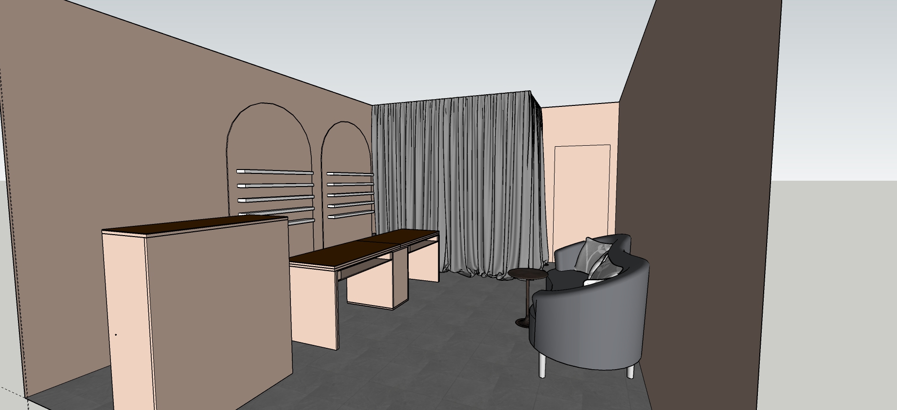 can you render this image its a nail salloon can you add led behind the wall half round shelfs and add sun light a little brown parts are brown glass at the photo