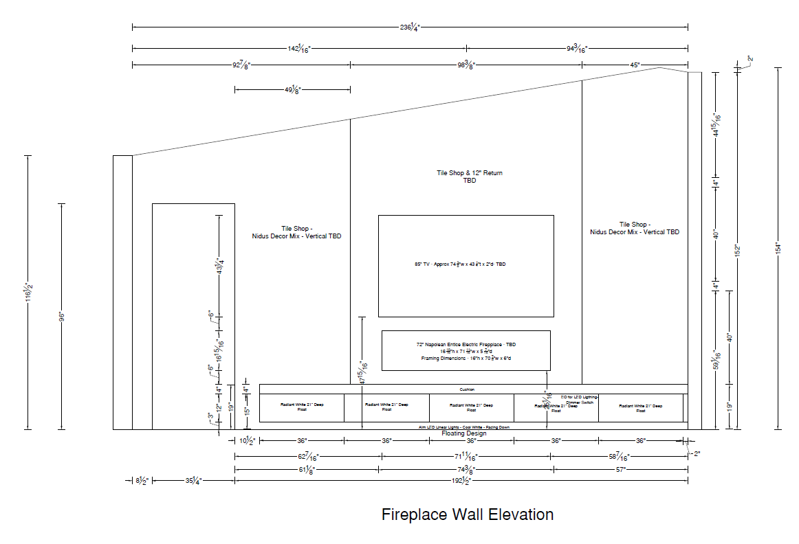 the elevation details a wall spanning approximately 236 in total width featuring central focal point television provision for an 85 tv approx 74 w x 43 h fireplace a 72 napoleon entice electric fireplace located directly below the tv storage cabinetry floating base a floating design base unit containing five drawers each 36 wide and finished in radiant white recessed lighting led linear lights cool white are specified for the underside of the floating base wall finishes the wall is divided into sections intended for tile from the tile shop specifically the nidus decor mix vertical dimension summary feature primary dimensions total wall width 236 max wall height 154 right side base cabinet height 15 from the floor tv fireplace inset width 71 11 16 door clearance left 35 wide opening