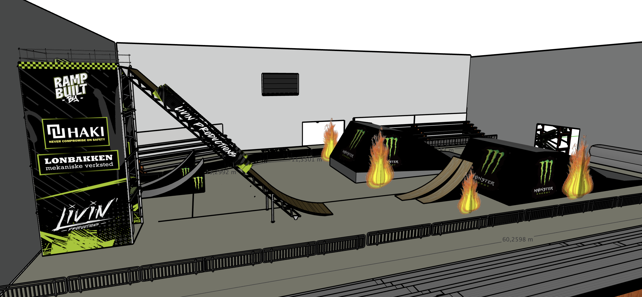 archsynth prompt mc messen pre show pyro hero final base image use the provided sketchup image as a strict geometry scale and layout reference do not remove move resize rotate add or replace any ramps landings platforms towers banners barriers audience areas or structures both landings must remain exactly as in the base image camera position and angle must remain unchanged location large indoor exhibition hall mc messen high ceiling with visible steel roof trusses concrete floor clearly an indoor motorsport exhibition arena structure the full ramp line must be intact takeoff ramp first landing second landing action no riders no bikes no people on ramps or landings the structure is waiting for the show to begin audience safety audience must be seated only on existing tribunes visible in the base image do not place people on the floor in run out zones brake zones ramp lines landings safety zones or technical areas all floor level areas must remain completely empty audience must be separated from the riding area by barriers exactly as in the base image lighting darkened indoor hall overall exposure slightly underexposed strong event spotlights illuminating tower ramp surfaces and both landings visible light beams in the air pyrotechnics large realistic indoor scale vertical flame effects flames must be taller than a person and powerful placed along the ramp line and near both landings as shown in the base image pyro must not block sponsor banners or hide any ramp elements slight variation in flame height and shape for realism atmosphere controlled event haze to enhance lighting and pyro glow no smoke clouds no fog ramp surface brown wooden trailer plates plywood matte finish slight wear and natural variation in wood texture branding haki lonbakken mekaniske verksted livin productions and ramp built by banners must be perfectly readable sharp undistorted and clearly lit accurate brand colors no added logos mood dark tense powerful high end professional production the audience is waiting the machine is ready overall goal create a realistic pre show hero image of the actual mc messen setup moments before show start with full ramp line seated audience dramatic lighting and pyrotechnics no public on the short wall to the right that is the braking zone no empty seats
