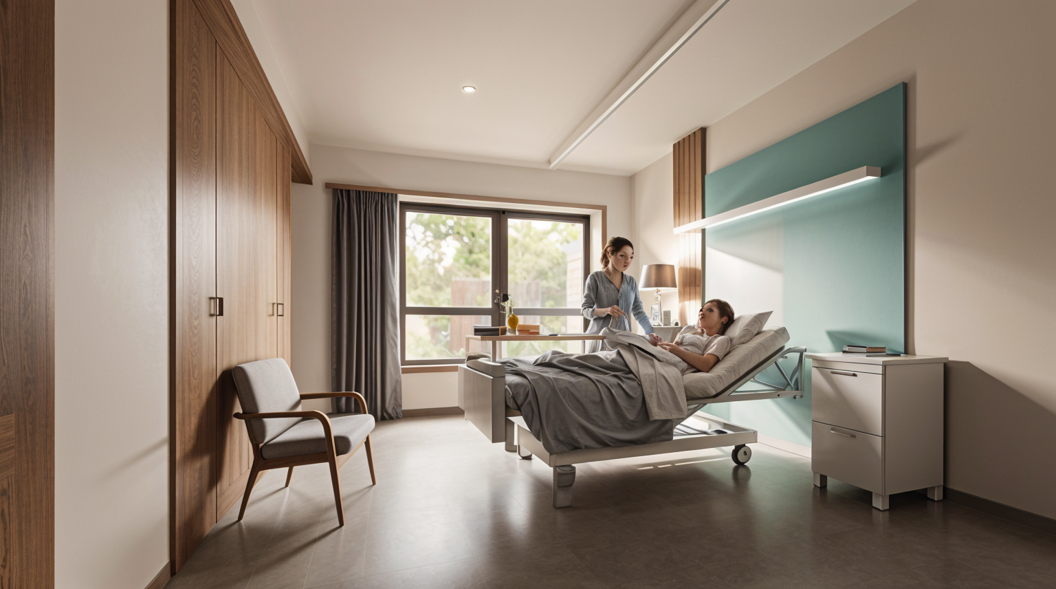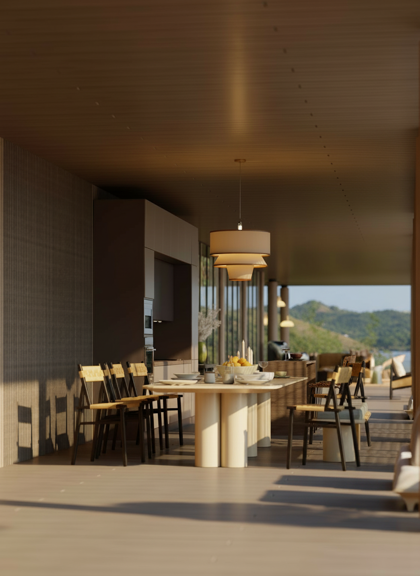 enhance the detail quality refine the tableware material the glass table fabric and candle refine chair texture and table texture both with timber material refine the pendant lamp cover from smooth texture banana paper with the soft light passed through it make the ambiance into morning sky the column of the building is natural timber with smooth luxury finish