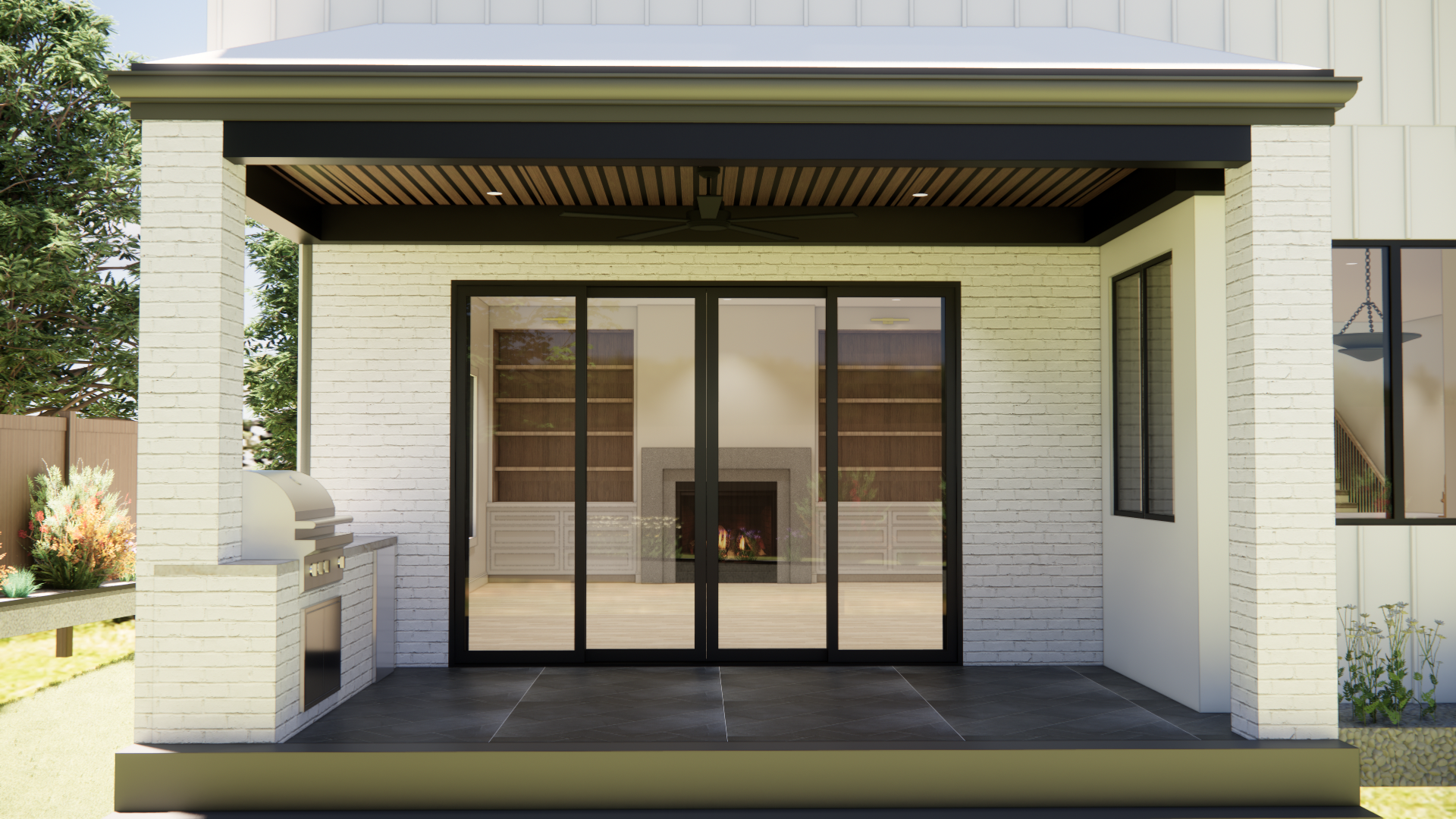 convert this outdoor porch and outdoor kitchen architectural rendering into a highly realistic editorial style architectural photograph while maintaining the exact architecture layout materials and proportions shown in the rendering do not redesign restyle or modify anything no creative interpretation only enhance realism do not add any prompts text labels graphics or overlays to the image all materials colors finishes and selections must remain exactly as they appear in the rendering the outdoor kitchen and porch columns are white brick maintain the exact brick color and layout while enhancing realism with natural mortar joints subtle brick texture slight tonal variation and realistic shadow depth between bricks the back wall is white hardie board siding maintain the exact siding layout while enhancing realism through natural board texture subtle shadow lines at joints and accurate exterior paint finish the flooring is tilebar fordham black 12 x24 tile installed in a stacked offset pattern maintain the exact tile layout and color while enhancing realism through natural stone texture subtle tonal variation between tiles realistic grout lines and a soft matte exterior finish if the outdoor kitchen includes appliances grills or stainless components maintain their exact locations and proportions while enhancing realistic brushed metal texture and natural reflections lighting should resemble luxury exterior architectural photography natural daylight illuminating the porch realistic outdoor shadows and sun direction balanced exposure between covered porch areas and open outdoor light natural reflections on tile brick and metal surfaces soft ambient light under the covered porch camera style should resemble professional architectural exterior photography full frame camera perspective approximately 35mm lens straight vertical lines crisp material clarity realistic outdoor color balance do not add or remove furniture landscaping fixtures appliances decor or architectural elements maintain the exact composition and design from the rendering the goal is strictly to enhance realism lighting and material texture so the image appears like a high end luxury outdoor living photograph used for a real estate listing overall mood refined outdoor living space with natural daylight realistic shadows and true to life exterior materials