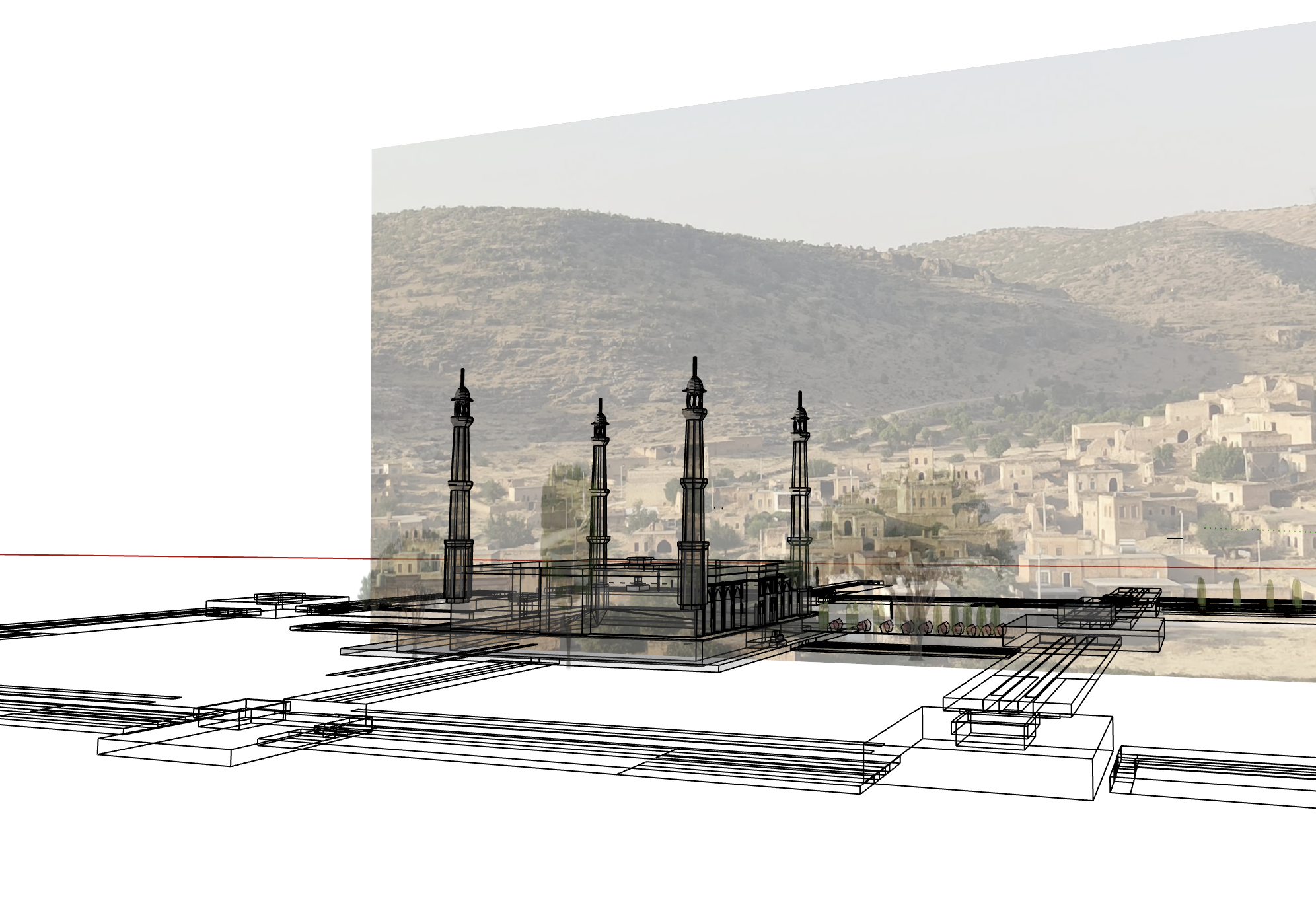 new urbanism exterior shot old ruins in nature thin corten steel bars modern architecture