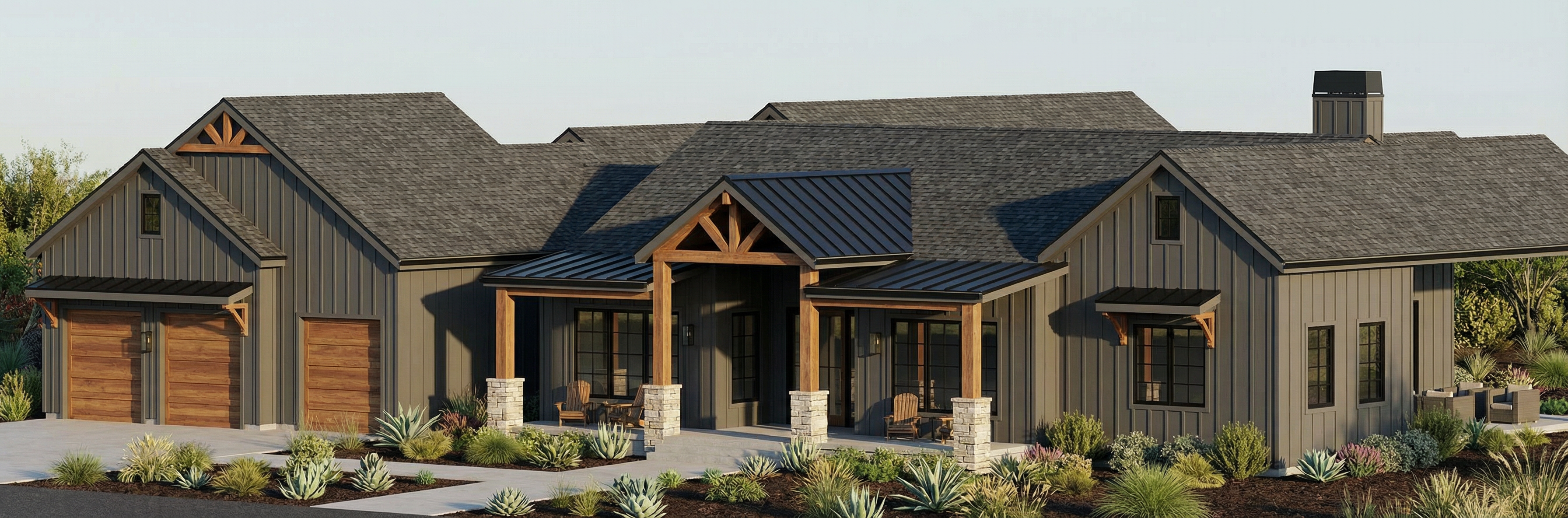 a modern farmhouse with black windows stacked limestone stained cedar accents very dark gray fascia and vertical shiplap siding black standing seam metal accents dark gray asphalt shingle roofing layered california native planting