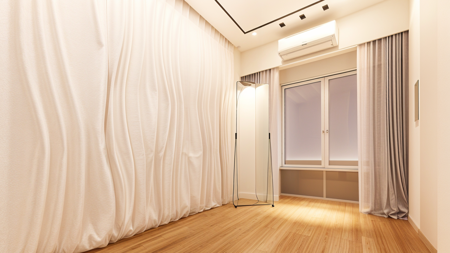 add wooden flooring to the floor maintain the wall texture exactly as in the base image it is made of pop plaster of paris not fabric so do not interpret it as a curtain preserve the existing wall pattern and ensure no changes are made to the base image use a beige and pastel color palette throughout