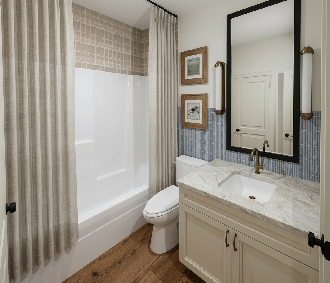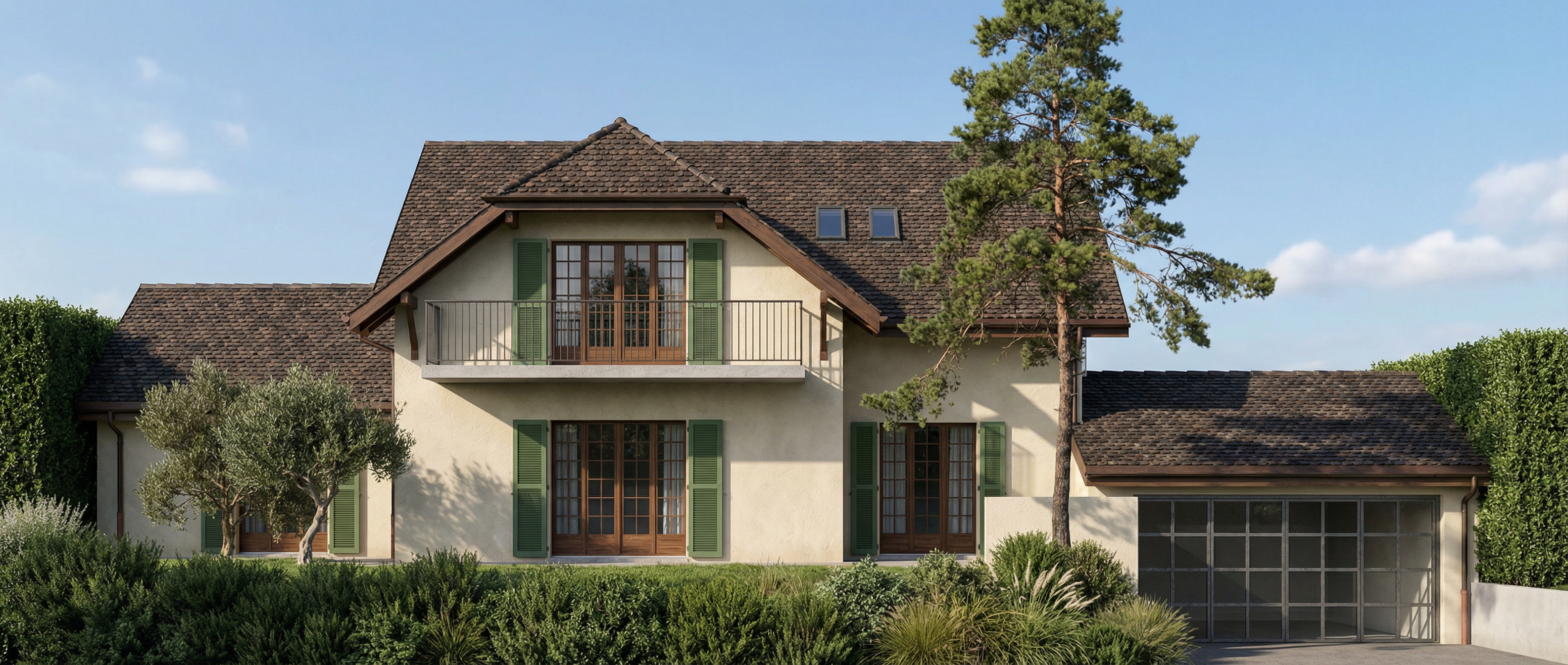 render a modern house with a steeply pitched roof made of dark grey slate the facade features a mix of natural stone and large glass windows the stone facade in varying shades of gray and beige providing a rustic yet sophisticated feel the windows are large and clear reflecting a bright blue sky the house is surrounded by lush greenery with vibrant flowering plants the atmosphere is serene and welcoming set in a bright sunny day extend landscaping to the front with car in driveway on the left add two people