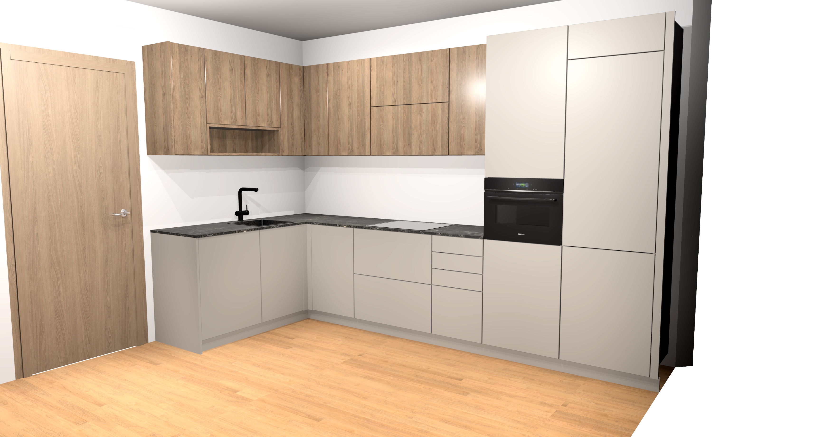 muebles color cachmere mate encimera m rmol marr n suelo tarima roble natural muebles altos en madera roble medio paredes pintura stucco crema ilumina el mueble abierto y pon tazas ilumina led 3000k todos los muebles altos a ade decoraci n cocina