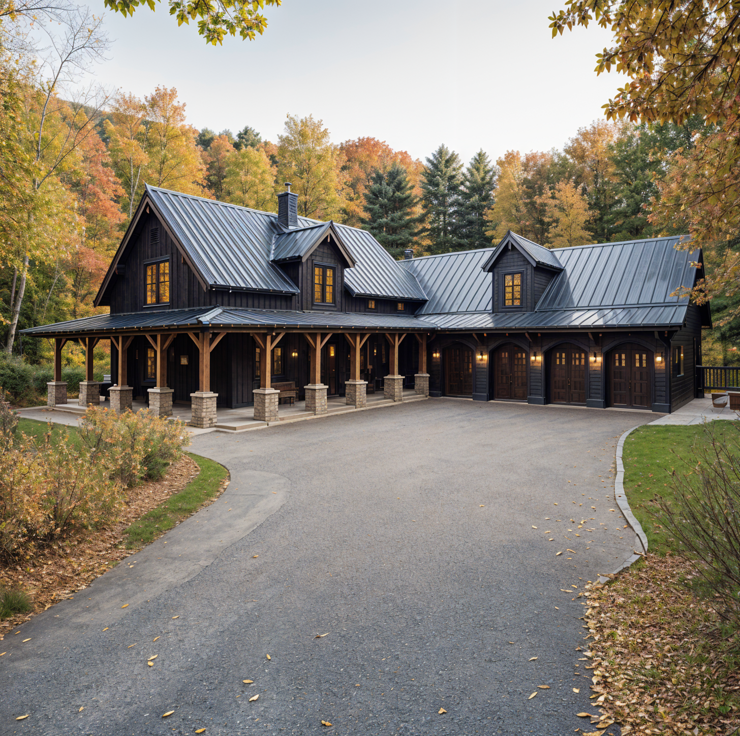 modernist exterior shot render a rustic elegant house surrounded by an autumn forest the house features a dark charcoal gray facade with a sleek matching metal roof large warm golden light glows from the windows creating a welcoming atmosphere the wooden pillars are a rich dark oak contrasting with light stone bases the driveway is a smooth light gray bordered by soft green grass surrounding trees display a vibrant mix of autumn colors deep reds oranges and yellows under a soft overcast sky that provides a serene cozy mood architecture