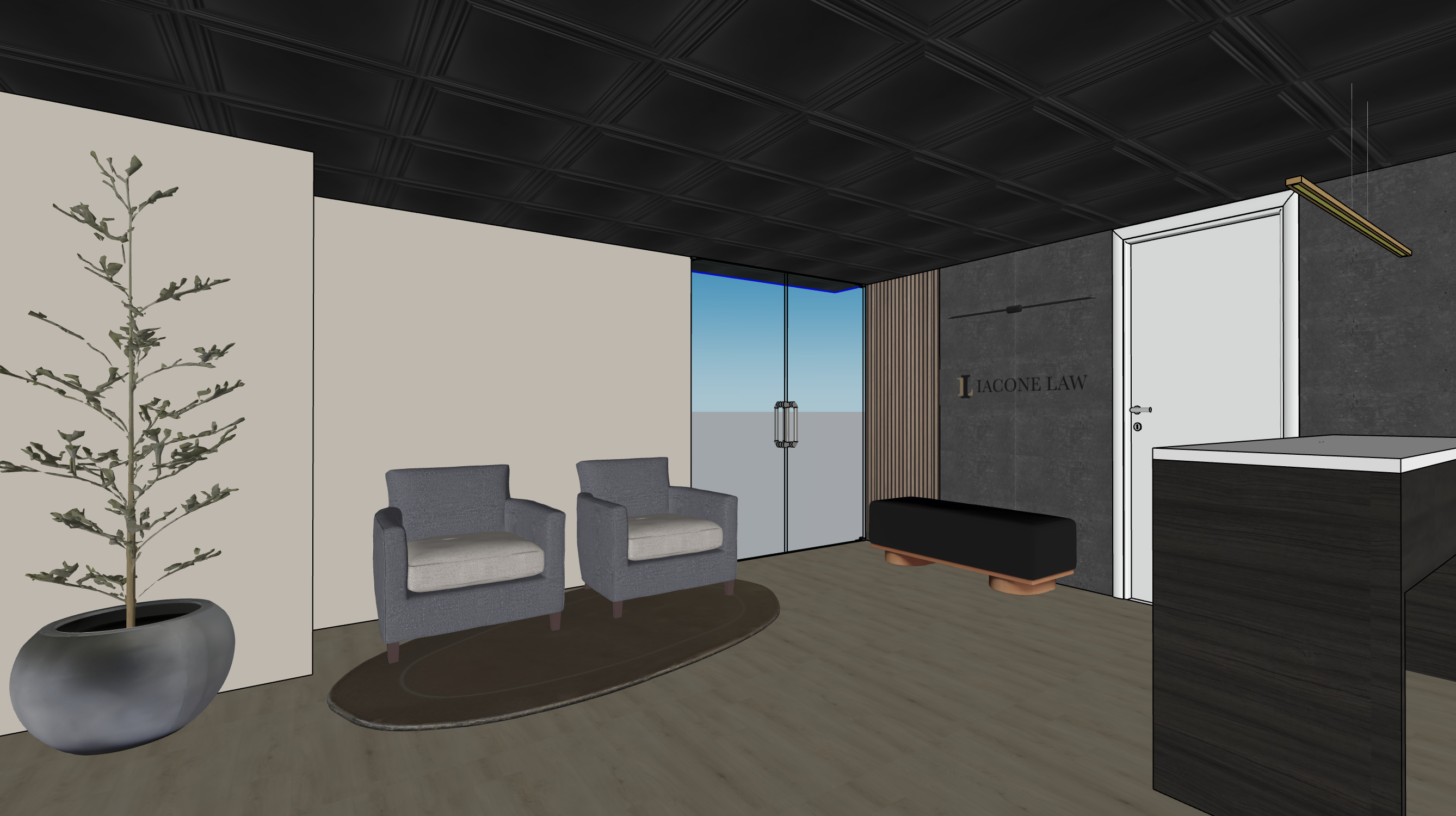the oval rug under the chairs is a caramel color and the glass doors to the right of the chairs leads to a hallway