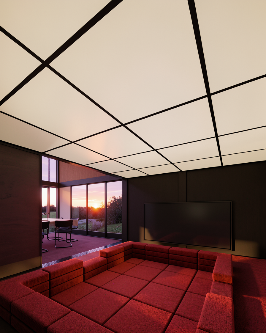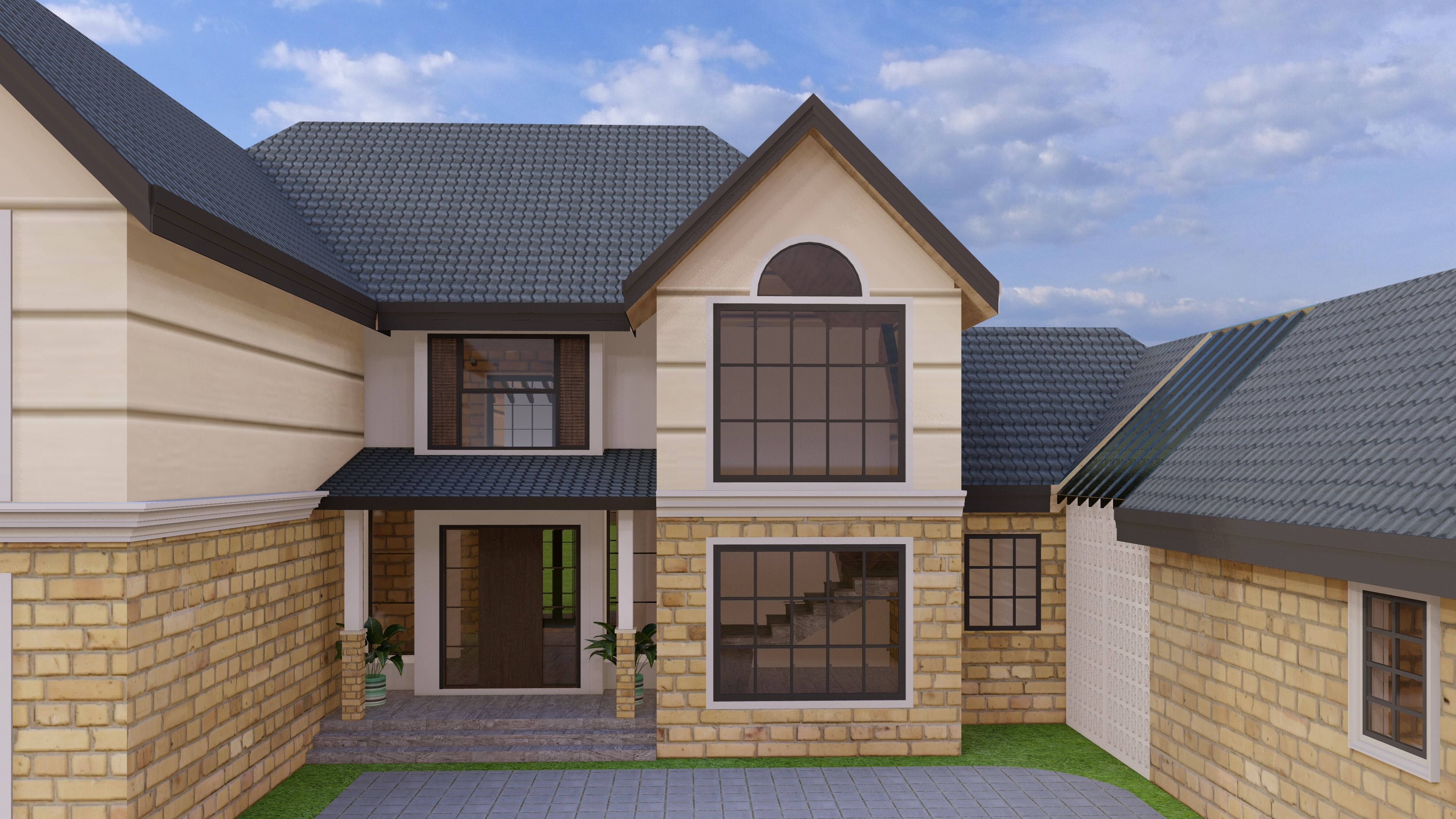 model of a house add few trees in background for context and very few vegetation with floral ones for context too picture should have sunsety vibe 4 p m