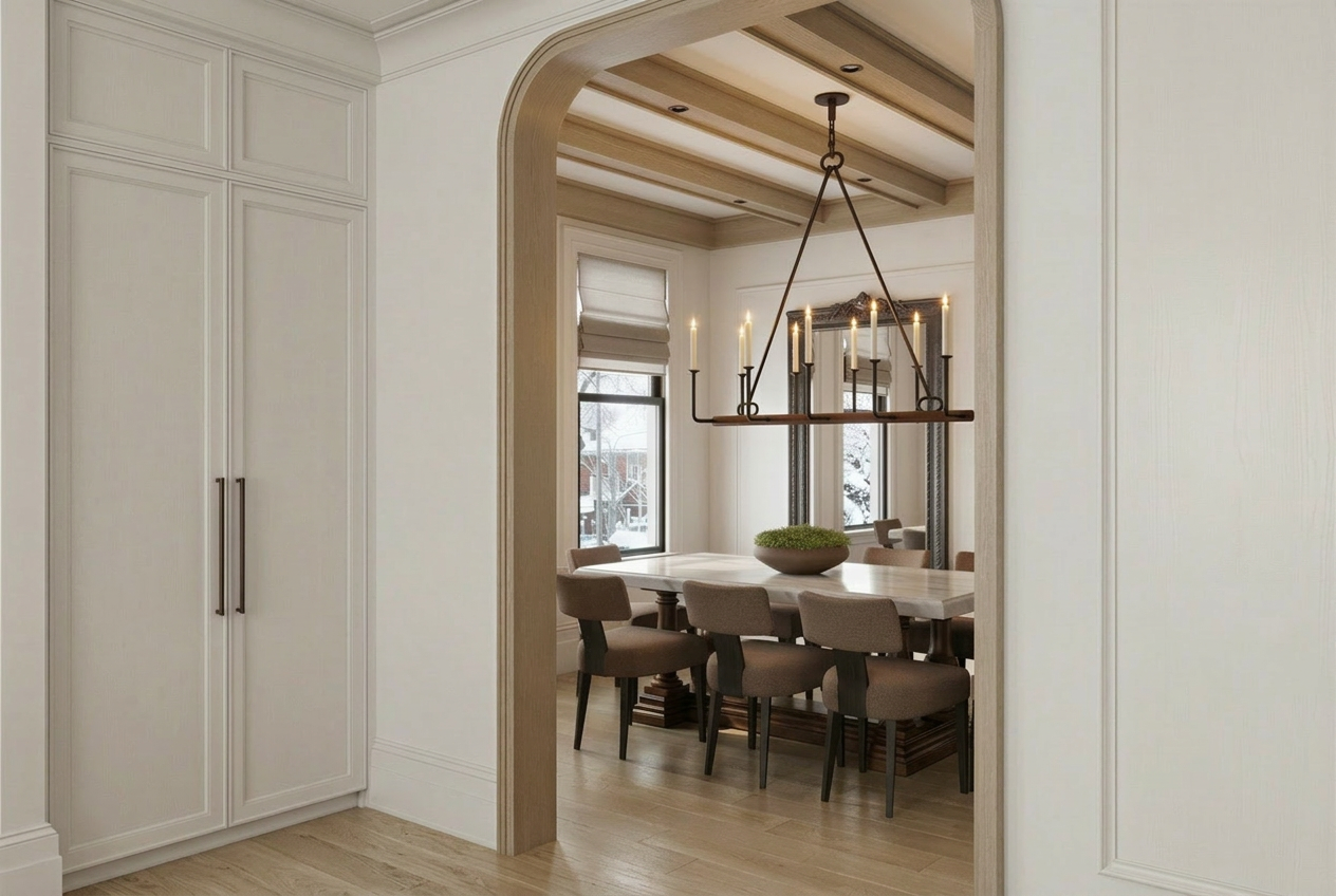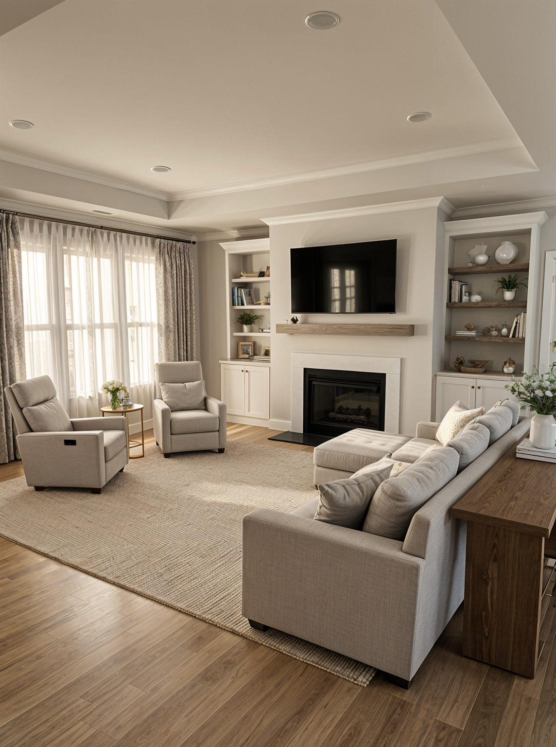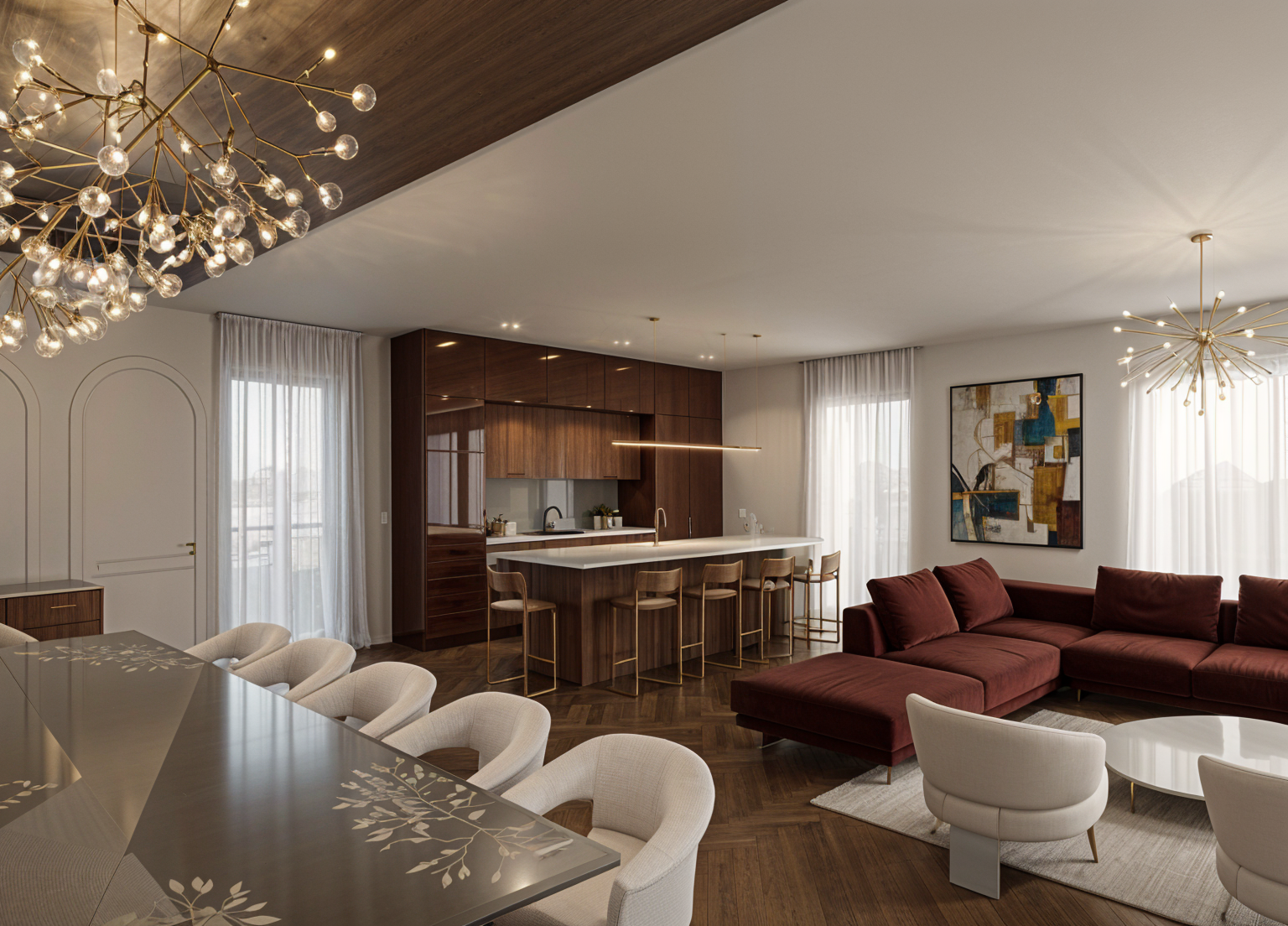 add open curtains by window and stool at the end