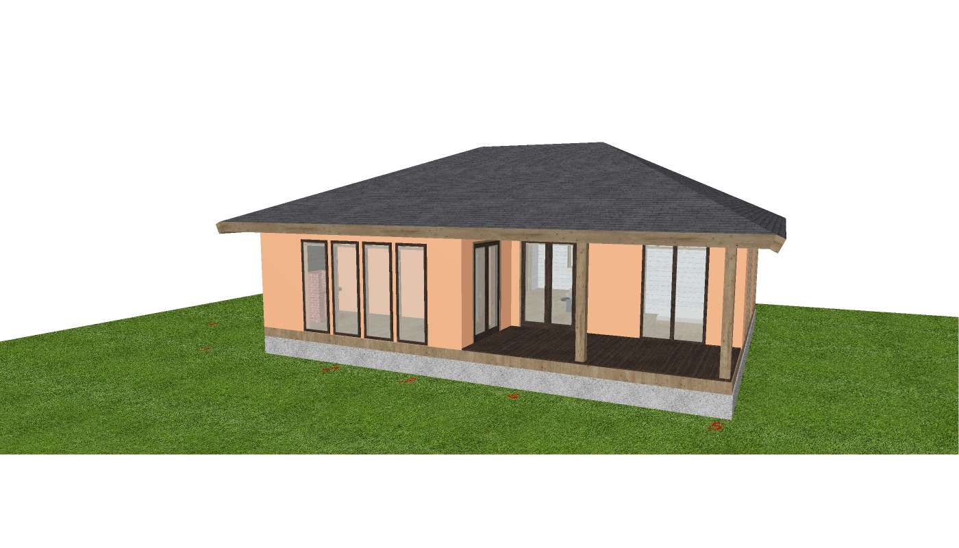 render a beautiful modern single story house with a warm peach exterior the roof is a sleek dark charcoal color large windows with dark brown frames reflect soft sunlight the porch features natural wood tones the setting includes lush green grass giving a fresh and inviting atmosphere the overall ambiance is serene and contemporary the lighting is gentle and warm evoking a peaceful afternoon