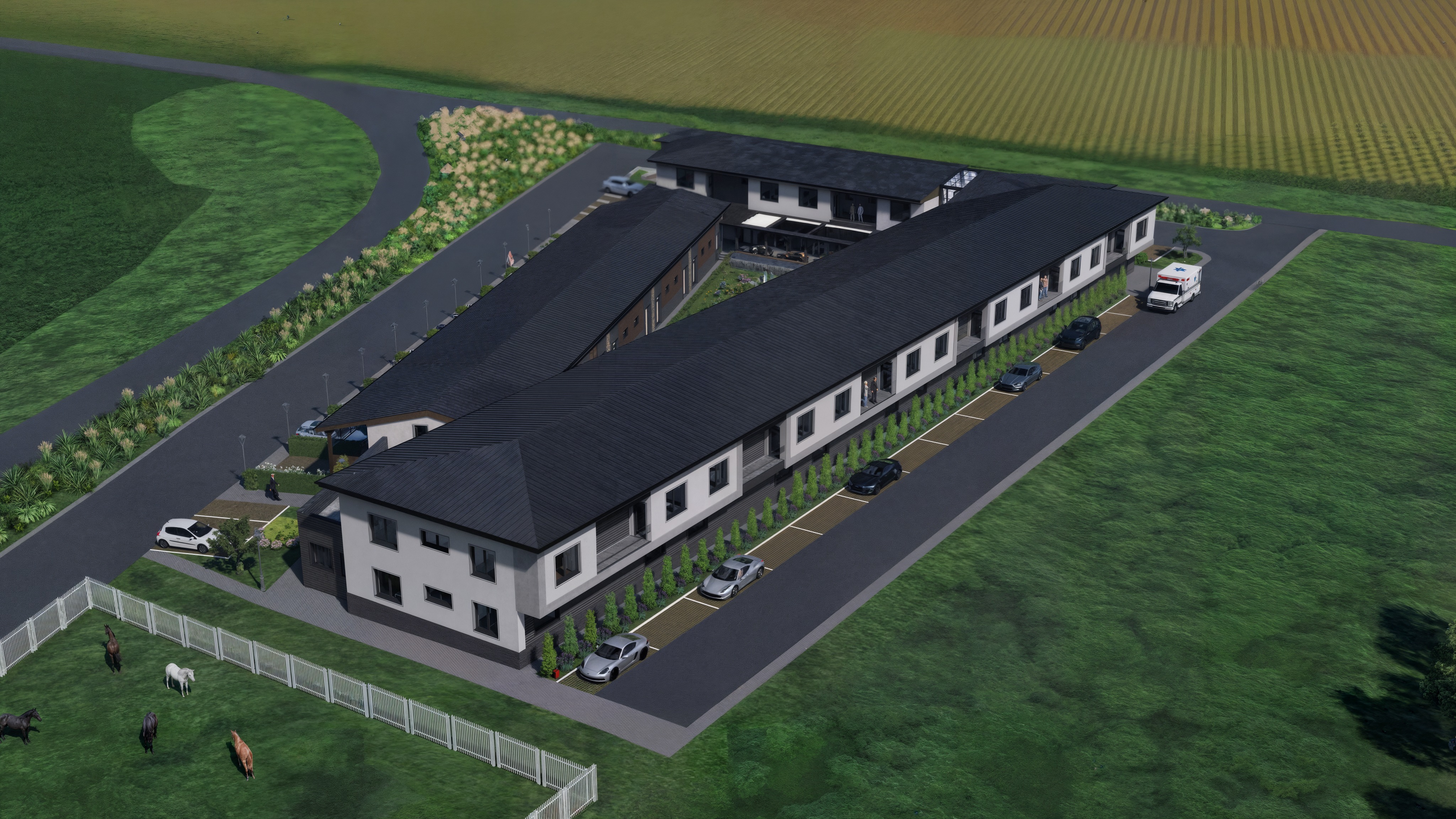 enhance photorealism with warm natural sunlight coming from behind the camera at a slightly higher angle illuminating the main facade evenly reduce harsh shadows on the roof and facade keeping soft natural shadow transitions increase overall brightness and exposure slightly to avoid a dull or underlit appearance replace the artificial looking agricultural field in the background with a more natural uniform grassy landscape or soft blurred terrain improve ground textures to look more realistic and less repetitive enhance materials clean white plaster subtle facade variations deeper matte roof texture realistic reflections improve vegetation with natural variation in color density and scale add subtle imperfections and randomness to break the cg look maintain a clear crisp atmosphere with no haze preserve geometry and composition exactly