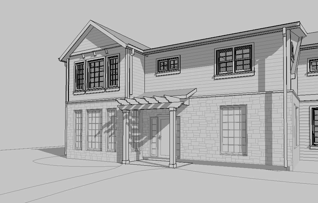 cape code style house subtle white horizontal siding and trim work 8 foot stone base grid windows entry patio with trellis walkway to door with mowed grass a couple large trees in background