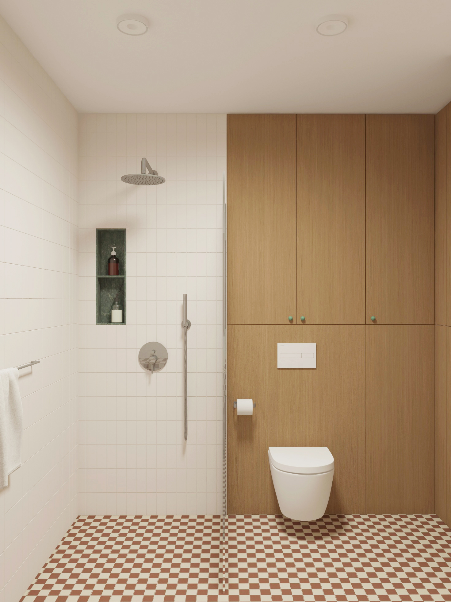 do not modify the original model geometry proportions layout structure or placement of any elements keep the exact same architecture forms and design do not alter or redesign any objects in the scene only improve the materials textures and surface details to achieve a significantly more realistic result enhance material accuracy using physically correct textures proper roughness values reflections bump normal maps and subtle surface imperfections maintain the original material intent while improving realism the scene is illuminated by ceiling lighting the lighting should feel natural and believable with realistic light intensity soft shadows accurate reflections and balanced exposure improve global illumination and realistic light interaction with all materials focus on high end photorealism through refined material definition realistic reflections subtle imperfections and natural color grading without changing the model geometry layout or design in any way colour balans is neutral the tile colour is beige do not change coulour balance the coulor of the wood is warm do not change the texture scene is iluminated by two ceiling spots