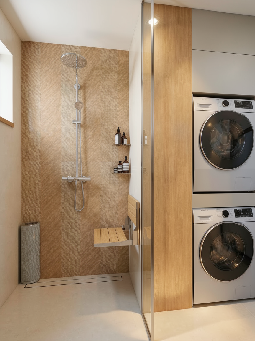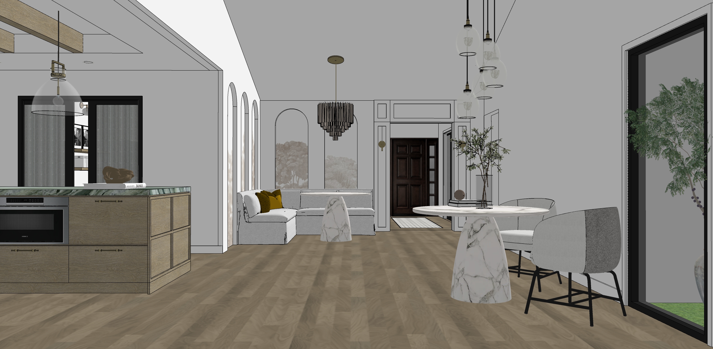 create a render in hyper realistic architectural visualization quality 8k resolution all objects furniture sanitary ware and architectural features must remain in place do not add any objects or delete anything from the image the spatial configuration must remain unchanged warmth gentle reflections soft shadows enhanced color richness and luxurious level realism improve depth and realism through wood grain richness brass highlights fabric texture and polished clarity while keeping the entire scene exactly as originally designed use general daylight lighting in the room but not too bright use a smooth white wall surface above the tiles the wall covering should be the same light color as the floor covering light is coming from kitchen windows on the left side and the light above the dining table is crystal and have a low light intensity in it floor is wooden laminate and all the wood in the scene to be light oak but not too red or yellow make the door color dark charcoal
