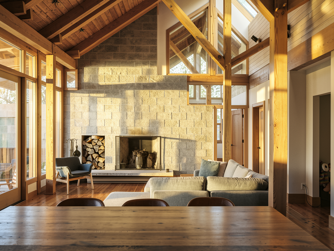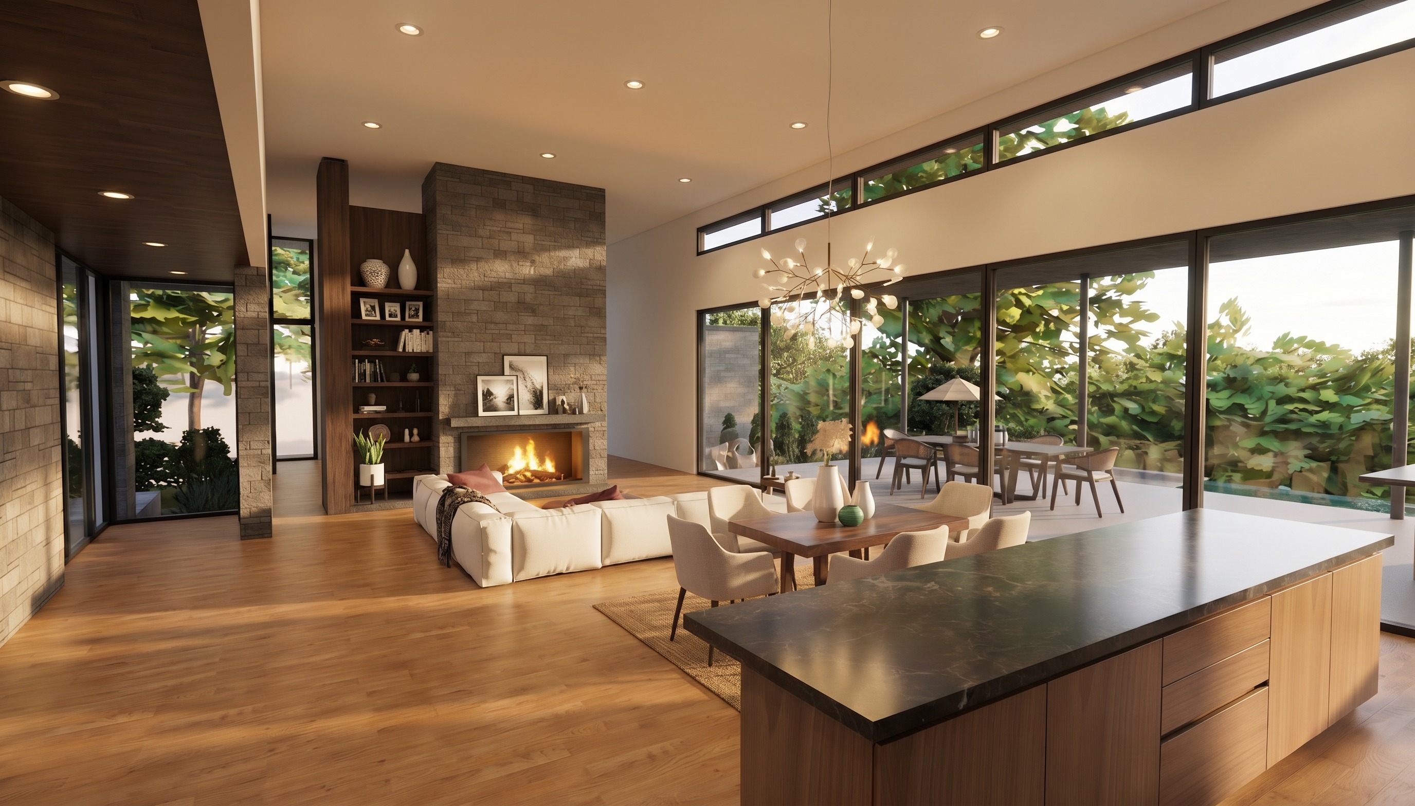 make floors less orange add a person standing at the island cutting vegetables add rug under the living room couch place art on the wall to the right of the fireplace
