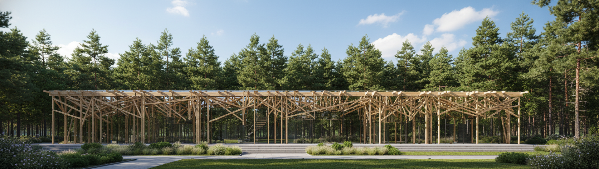 add dense forest in the back and on the sides pine and spruce wooden construction in pine