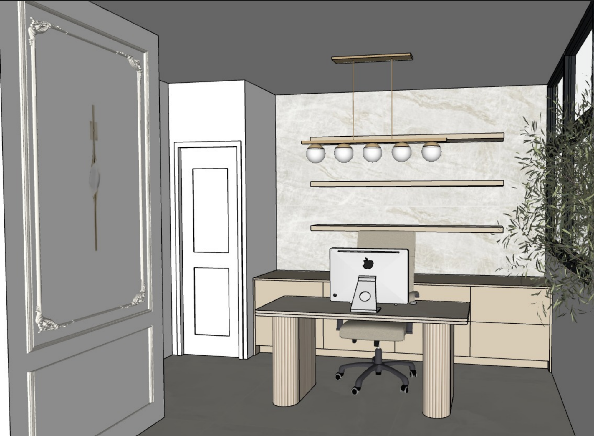 make it to look realistic luxury office led under shelves taupe color cabinet painted shelves and desk white cream walls olive tree on the right side t molding with sconses inside the frame cream polished floor