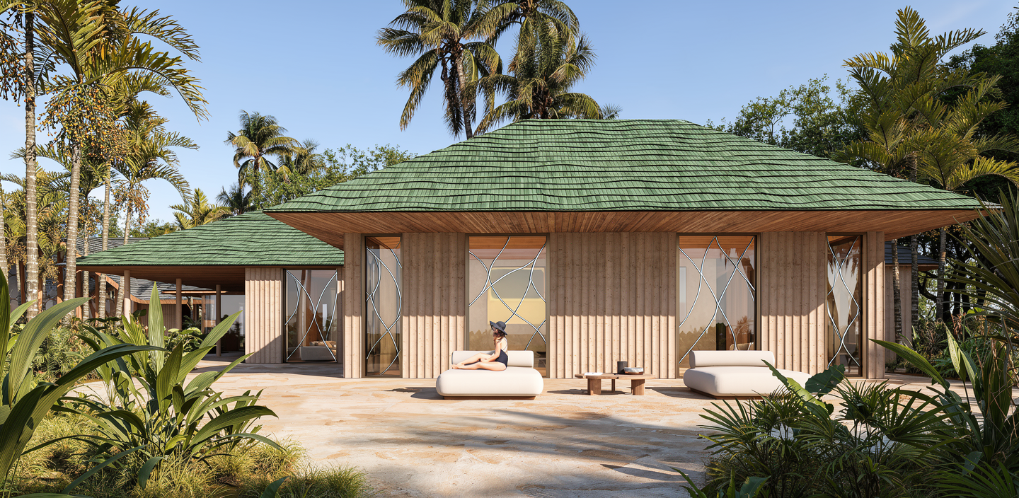 architectural visualization accurate geometry no design changes soft southern california daylight diffused coastal light gentle shadows warm neutral color palette cement cladding with subtle board form texture matte mineral surface slight tonal variation light plaster elements with soft finish calm residential atmosphere reduced contrast soft transitions professional architectural photograph no dramatic lighting no sharp highlights
