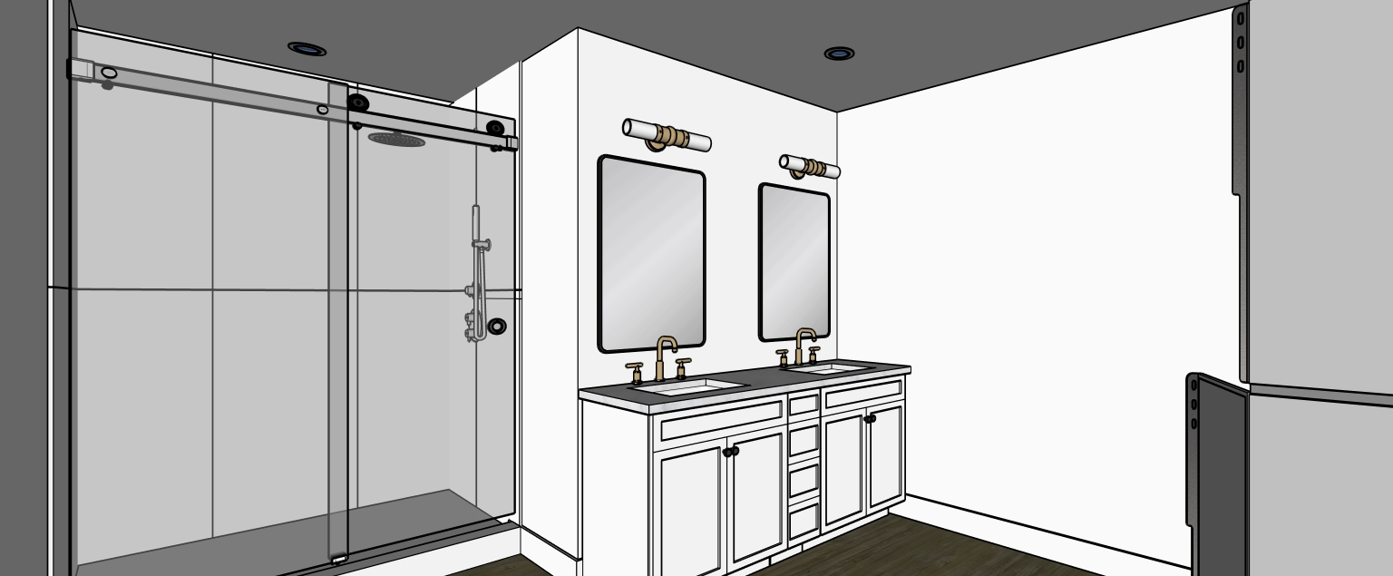 modern minimalist bathroom large 2 x4 format tile grey brusked gold fixture and trims white shaker cabinet light wash shower wall