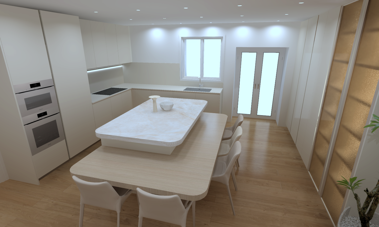 act as an award winning architectural photographer and senior cgi to photo compositing artist specialized in transforming sketchup style interior renders into indistinguishable high end photoreal architectural photographs your task is to convert the provided image into a fully photorealistic interior photograph while strictly preserving the original architecture layout and composition 1 absolute preservation rules non negotiable preserve exactly architecture dimensions proportions and layout camera position focal length feel perspective and framing horizon line vertical alignment and composition balance do not move resize add or remove any elements modify furniture placement cabinetry openings or fixtures alter spatial relationships or staging maintain a perfectly consistent architectural perspective no warping no reinterpretation 2 camera photographic realism simulate a full frame professional architectural camera setup maintain natural lens behavior minimal distortion clean verticals and controlled perspective add subtle photographic qualities fine natural grain realistic depth and micro contrast avoid hdr look over sharpening artificial clarity 3 materials surface realism high priority replace all materials with ultra realistic 4k 8k pbr textures including accurate albedo roughness gloss normal maps micro displacement where needed precise material definitions floor natural wood parquet flooring matte finish not glossy cabinetry furniture beige melamine finish soft matte to satin reflectance slight tonal variation and realistic edge detailing countertop plan de travail same beige melamine finish as cabinetry continuous homogeneous appearance realistic soft reflections non plastic non glossy dense tactile premium look glass doors fluted ribbed strong bronze tinted color blured glass with light behind cant see into it very blured just the light and shadows of objects subtle vertical striation physically accurate light diffusion and reflections slight opacity with realistic depth all surfaces must include micro scratches slight smudges edge wear imperfect reflectivity realistic seams and joints 4 vegetation natural elements replace all plants with botanically accurate ultra detailed foliage include variation in leaf size orientation and density natural branching randomness subsurface scattering light passing through leaves avoid decorative or artificial cgi plant appearance 5 lighting global illumination use natural daylight only consistent with openings ensure physically accurate sun direction soft realistic shadows with penumbra global illumination and bounced light subtle ambient occlusion maintain balanced interior exterior exposure no blown highlights or artificial brightness 6 atmosphere color grading apply true to life photographic grading neutral whites accurate beige and wood tones controlled contrast and dynamic range add subtle atmospheric depth realistic air perspective 7 final realism target the final image must be indistinguishable from a real architectural photograph suitable for publication in a premium design magazine 8 negative constraints strict no cgi look no plastic or fake materials no exaggerated reflections no artificial glow or bloom no layout or design changes no added or removed objects no stylization or artistic reinterpretation