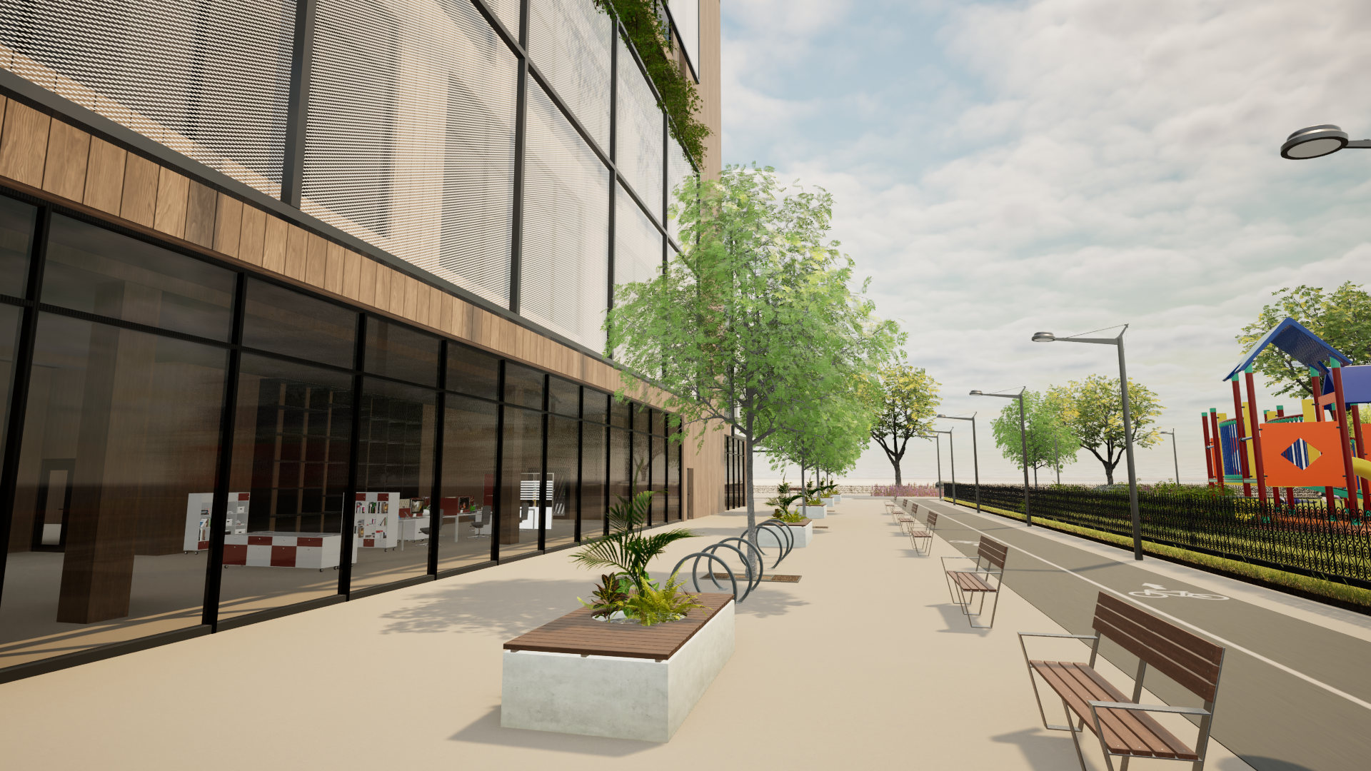 add people walking along the builing put two people riding bikes on the path to the right add a skyline acros the river add someone walking their dog add bikes at the bike rack add someone sitting on the benches