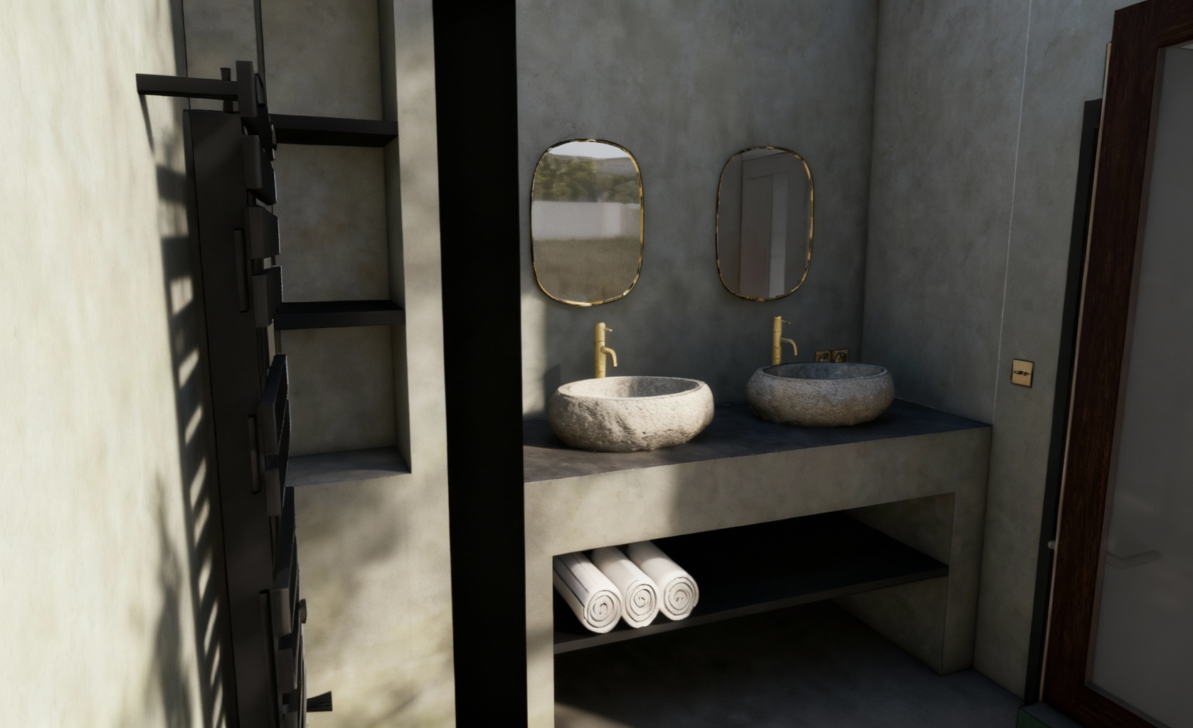 barndominium interior shot a cozy modern bedroom with soft ambient lighting the walls are a smooth light gray creating a calming atmosphere the bed has a dark indigo headboard and is dressed with a deep emerald green duvet paired with matching pillows for a luxurious touch the wardrobe is a subtle taupe seamlessly blending into the room s design the flooring is a light oak wood adding warmth and texture the side table and desk are sleek in a charcoal gray complementing the overall palette the vase on the desk is a deep ocean blue holding delicate silver flowers the window frames allow soft natural light to filter through casting a gentle glow across the room architecture
