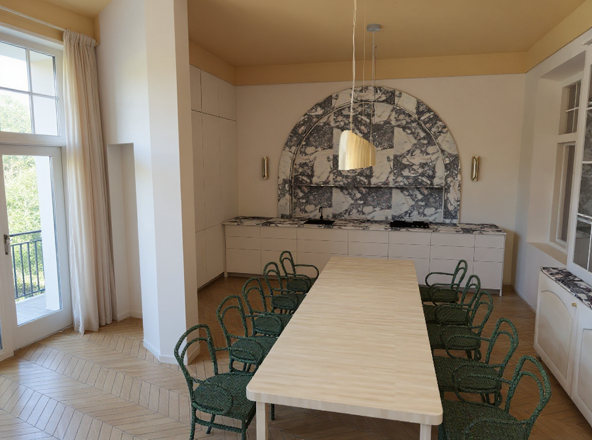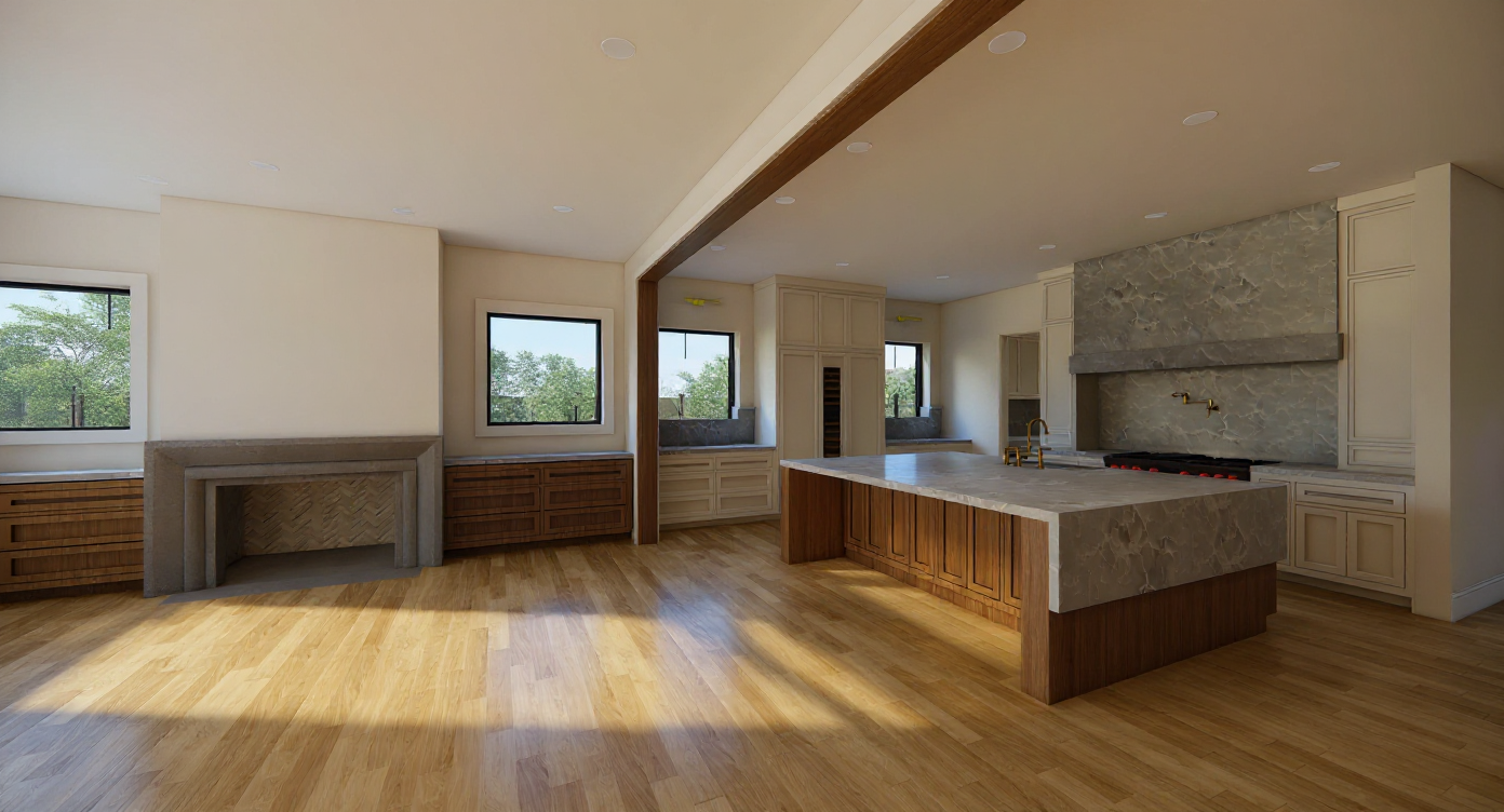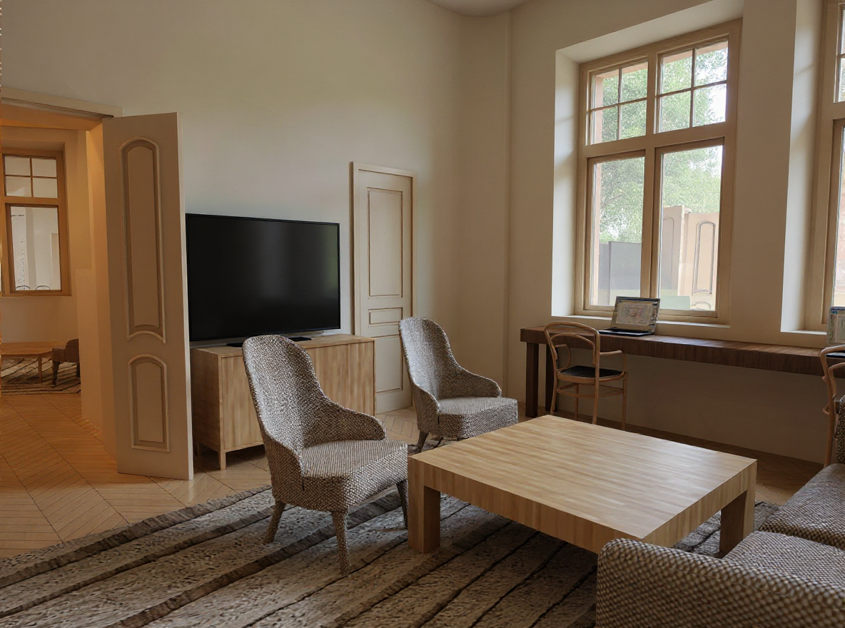 make a black and white outlines architecture and the matrial color should fade from right to left the material stay the same