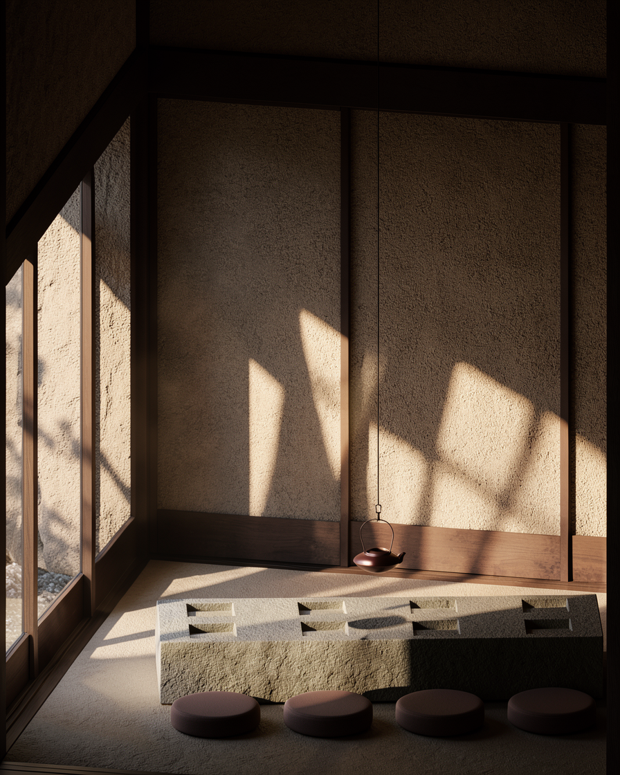 serene contemplative tea room that leans heavily into japanese wabi sabi aesthetics a low monolithic earth tea table sits as the focal point paired with simple circular floor cushions and a traditional hanging kettle suspended by a thin wire the space is defined by textured earthy walls and dark timber framing long geometric shadows that emphasize the room s quiet meditative atmosphere