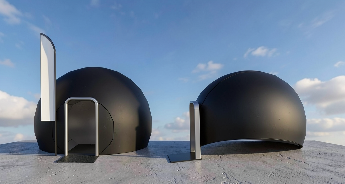 keep color and structure the same make look lifelike exterior of dome structure is matte black smooth tarp over a geodesic dome shape interior of dome is white place on gray concrete like a parking lot with blue sky in the background