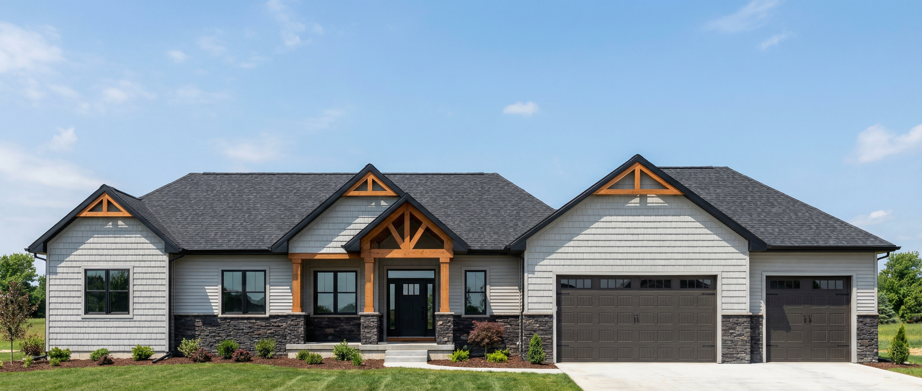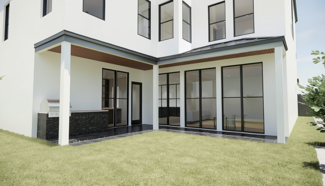 convert this architectural rendering into a highly realistic editorial style luxury outdoor photograph suitable for marketing and listing imagery maintain the exact architecture layout geometry porch structure ceiling design openings and proportions exactly as modeled do not redesign restyle or modify the architecture in any way do not move walls columns windows doors or built in elements enhance realism only through natural lighting accurate material texture subtle reflections and soft shadow depth the final result should feel like a professionally photographed architectural digest style exterior used for luxury real estate marketing materials in the space include tilebar 12x24 black slate tile flooring in a offset pattern smooth stucco sherwin williams pure white roof standing seam charcoal metal with no slope flat roof soffits and fascia painted sherwin williams origami white gutters and downspouts in charcoal finish fluted wood ceiling cladding the black slate tile should appear natural matte and slightly textured with subtle tonal variation and realistic grout lines the herringbone pattern should read clearly with correct scale and alignment the roof shingles should appear textured and dimensional with natural variation consistent with charcoal architectural shingles the soffits and fascia in origami white should appear soft and clean with subtle tonal depth the gutters and downspouts should appear matte charcoal with realistic metal finish and clean edges the fluted wood ceiling should show realistic wood grain depth and shadow between flutes with a warm natural tone do not add or modify any furniture if furniture is present keep it minimal and secondary to the architecture without adding new elements the outdoor space should feel elevated calm and refined with a strong connection between the porch and yard lighting should include soft natural daylight with gentle exterior shadows and realistic light falloff the lighting should feel balanced and editorial not harsh or overly dramatic the final image should appear crisp photorealistic and editorial similar to a professionally photographed luxury exterior avoid warped or exaggerated wide angle distortion the perspective should feel natural as if captured by a professional architectural photographer with straight vertical lines and balanced proportions do not alter architecture layout geometry or materials only enhance realism the yard is mostly grass the only part with the slate look floor tile is under the porch itself
