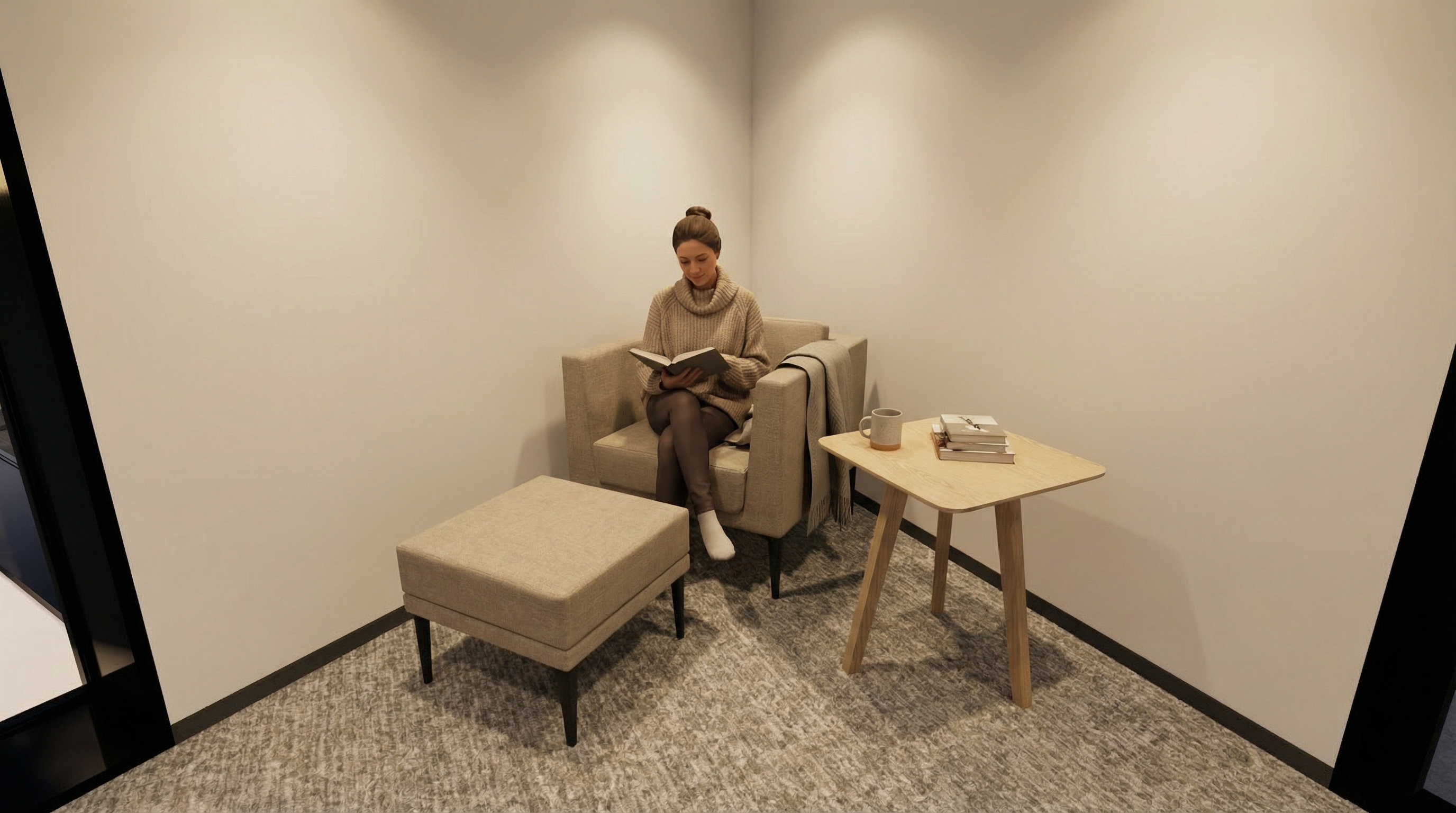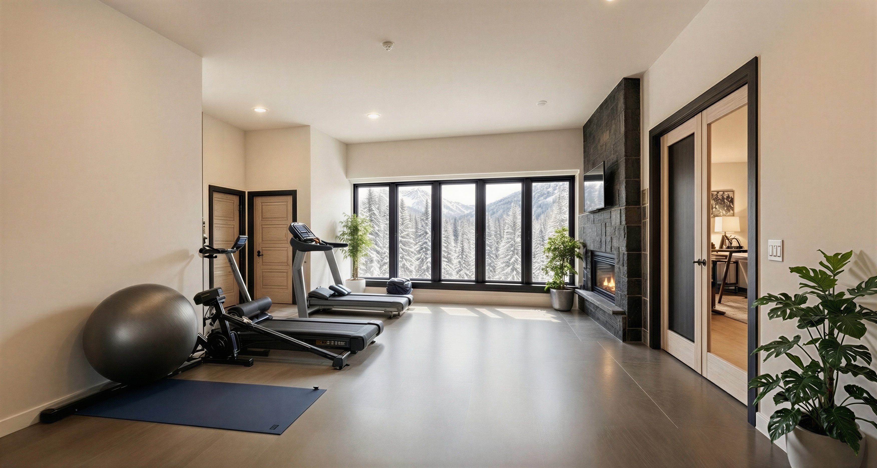 high end private workout room with yoga matt and yoga ball add framed art on the walls and the top of a luxurious chair in the lower right foreground