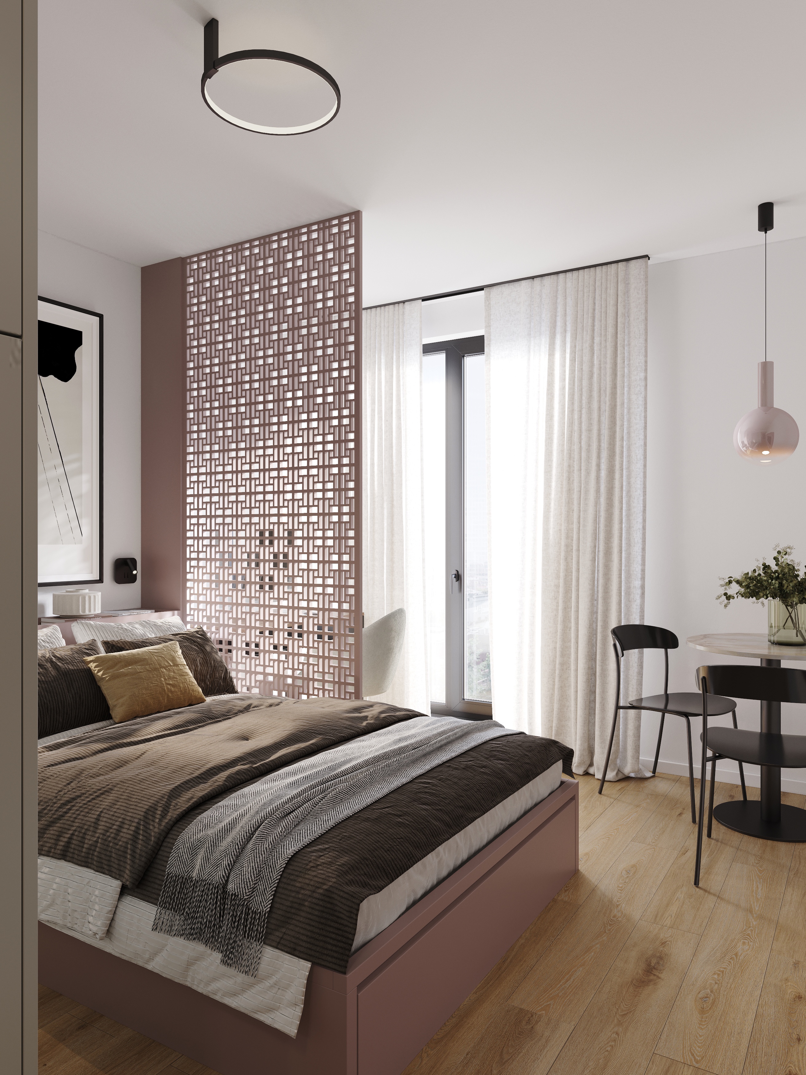 make professional visual of modern interior with nicely defined textures and matt finishes the red bed frame and wall partition have more saturated tone
