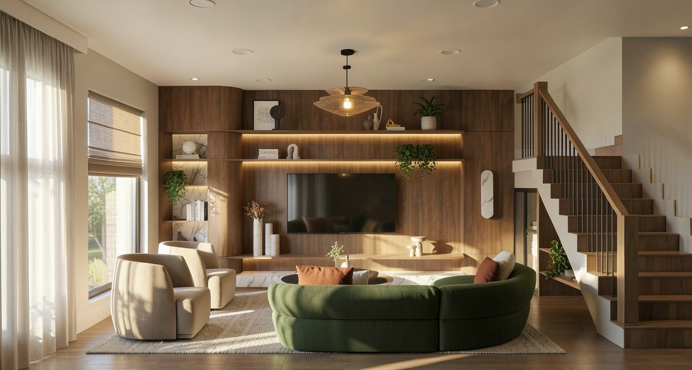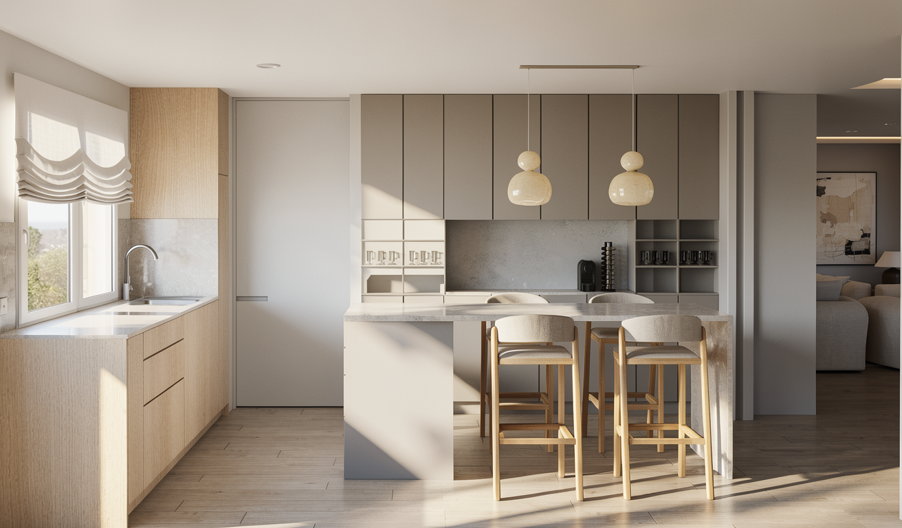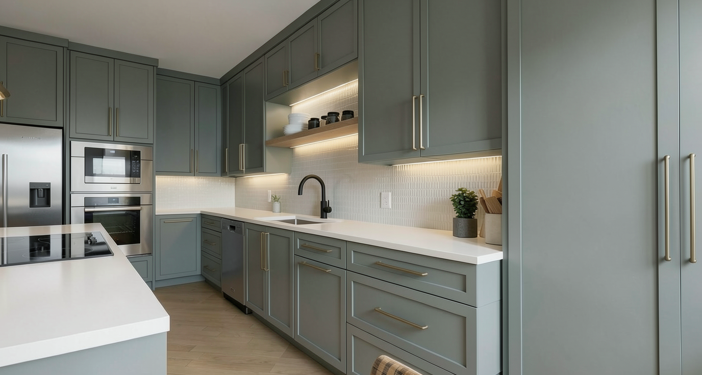 a charming and elegant bathroom with soft white upper walls and sage green subway tile wainscoting on the lower half decorative encaustic cement floor tiles in a blue and white floral pattern white painted window trim and baseboards a freestanding white soaking tub sits in the corner beneath two large white framed windows dressed with soft gray roman shades with a snowy winter forest view outside a natural wood vanity with cane door panels a single drawer chrome hardware and a white marble countertop with an undermount sink sits against the right wall a large rectangular mirror with rounded corners is mounted above the vanity flanked by two brushed gold double sconce lights a glass vase with fresh greenery and hydrangeas a reed diffuser and small soap bottles are arranged on the vanity countertop a single square white return air grille approximately 14x14 inches is mounted flush into the flat white ceiling near the interior wall painted white to blend seamlessly with the ceiling surface soft diffused natural winter light filling the space