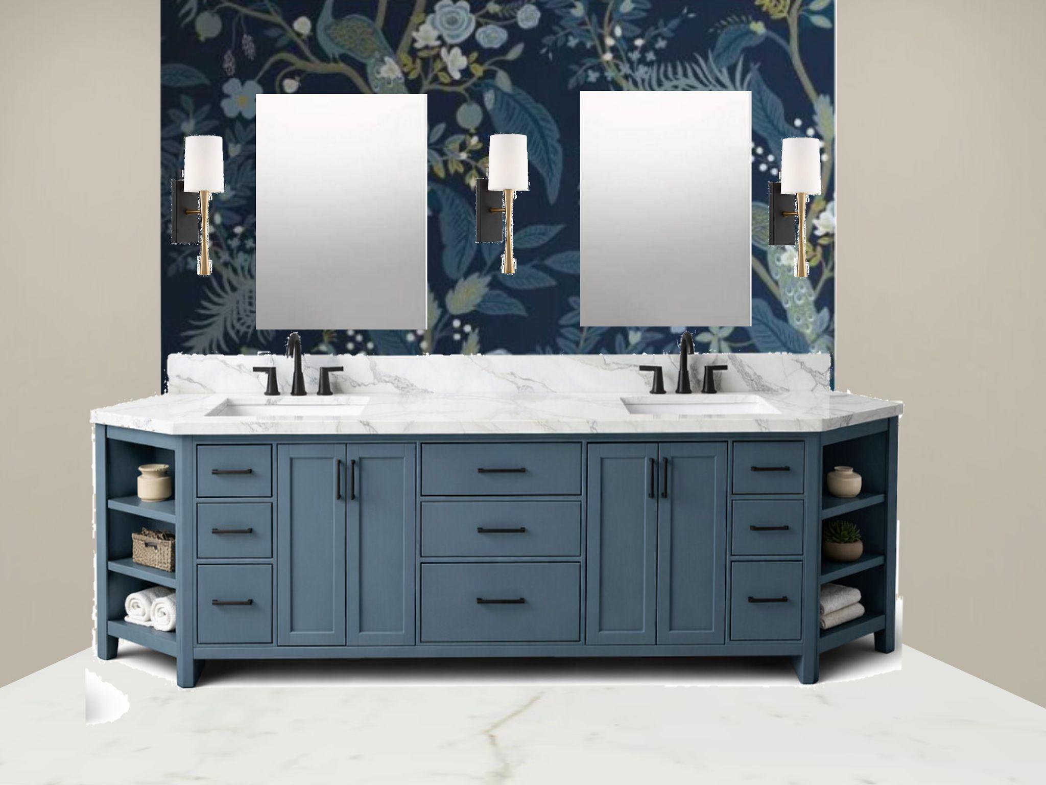 show me a photorealistic image of this vanity space but make the hardware on the cabinet pulls on the vanity matte gold to match the gold on the sconces the backplate on the sconces are black the silver rectangles are mirrors make the print on the wallpaper a little bit smaller and do not change the color of the vanity be sure to angle the side walls as they are in this image