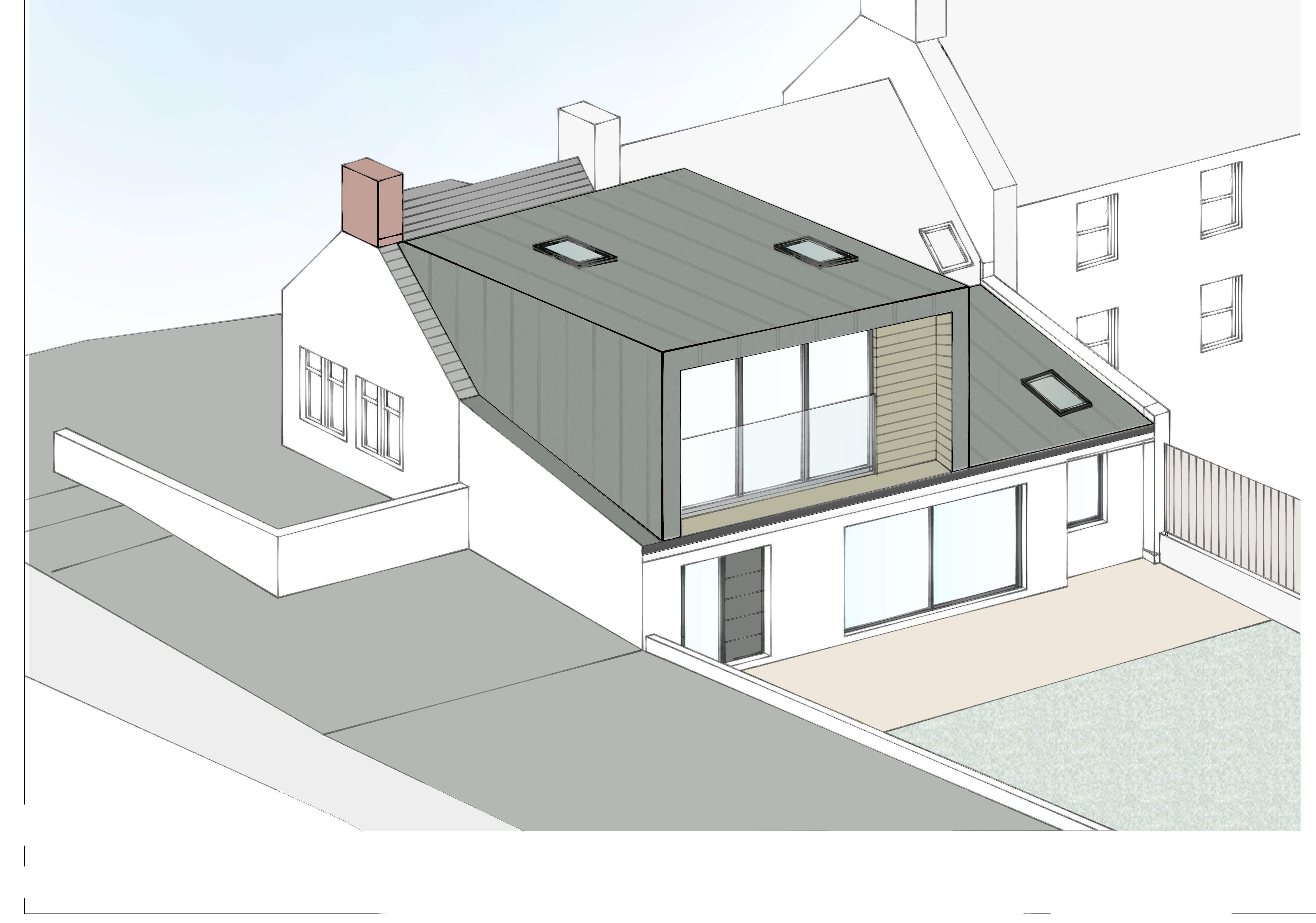 exterior shot include lighting sunset skies include glass balustrade on top floor doors make sure bottom doors are same level to ground green zinc