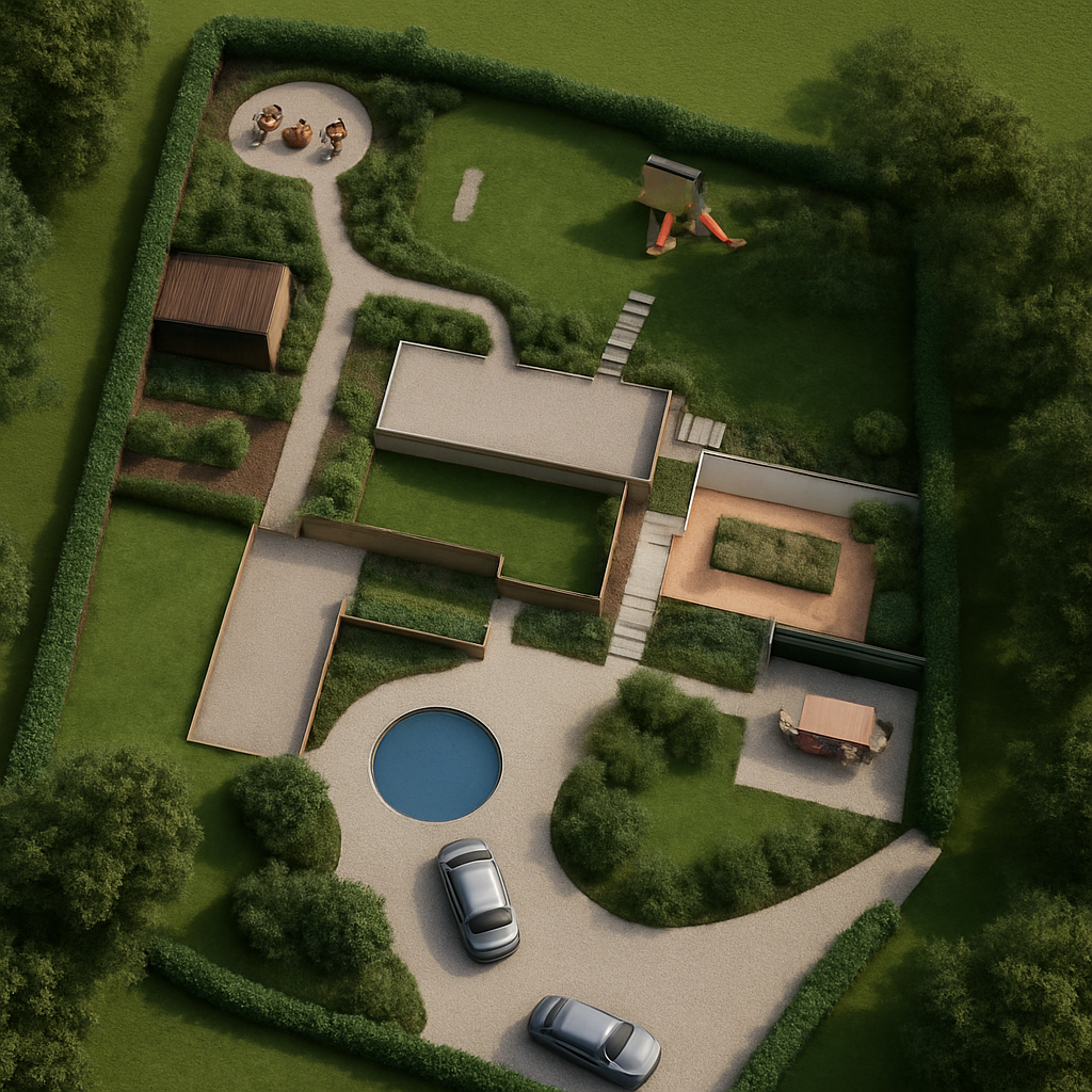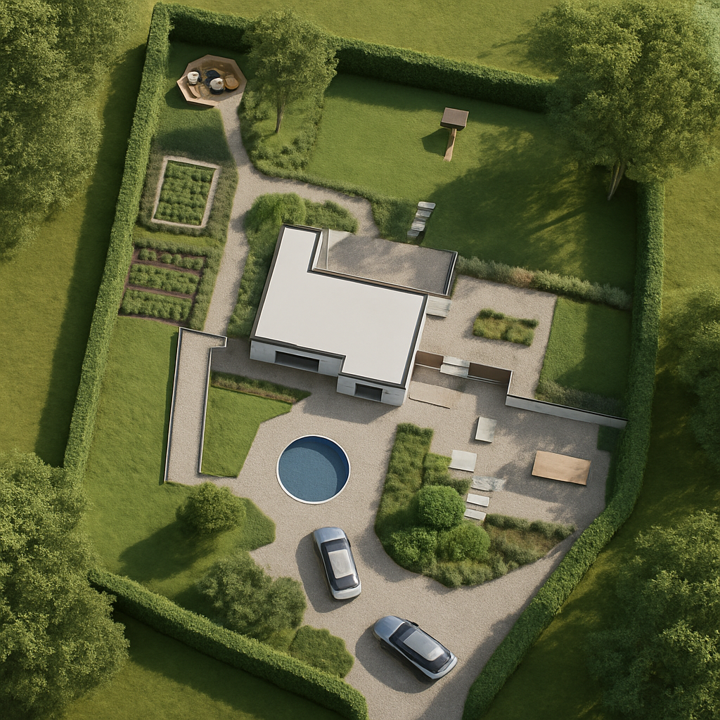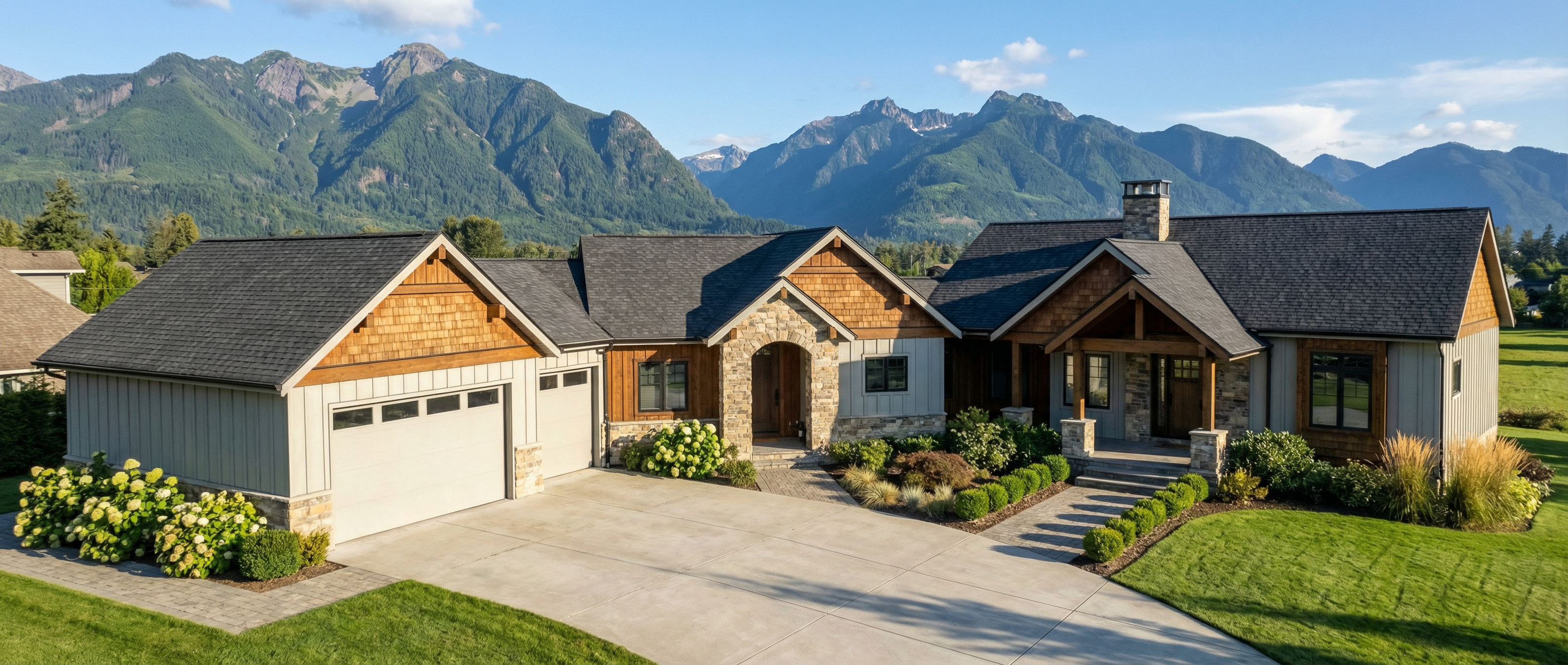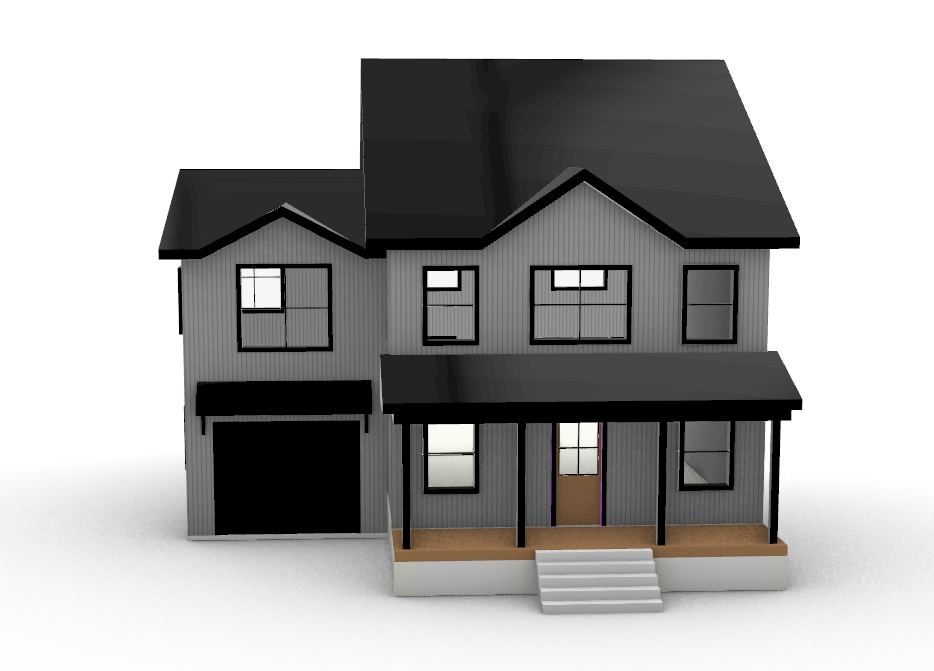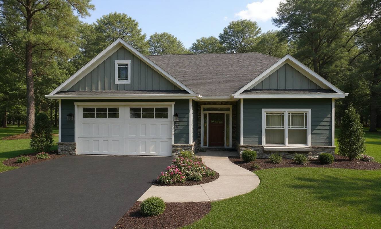 change color siding color to white make it horizontal on the main house and vertical on the garage put it in a neighborhood