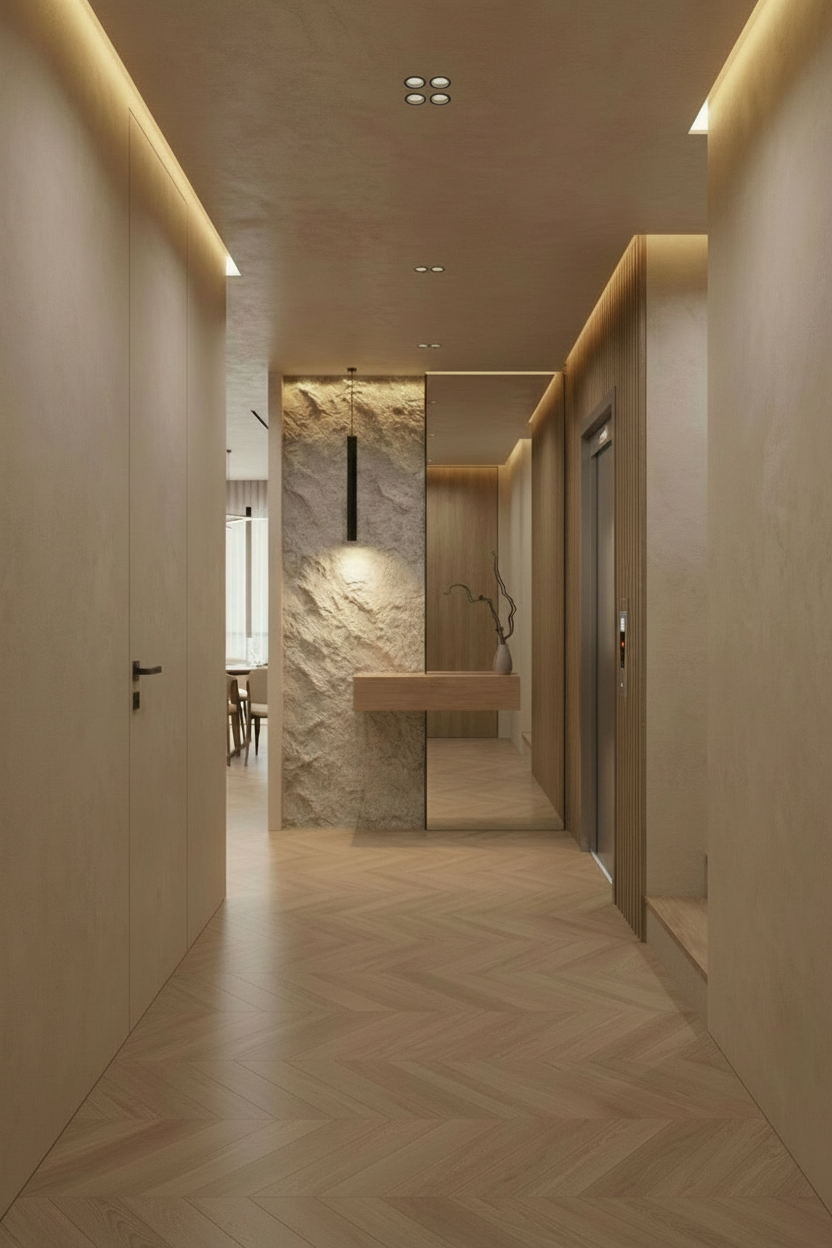 preserve the entire uploaded image exactly as is keep all geometry architecture camera angle perspective lighting materials textures and reflections unchanged do not modify anything except the specific edit below only required edit remove the stairs on the right wall completely this area is not a staircase structure replace it with a clean continuous floor extension that matches the existing floor material perfectly the floor should extend inward naturally as if the space between the walls continues uninterrupted ensure the transition is seamless with no visible steps risers or structural additions strict rules do not add stairs or any stair like geometry do not modify walls lighting camera or materials elsewhere do not redesign or reinterpret the space do not introduce any new objects or architectural features only remove the stairs and extend the floor surface