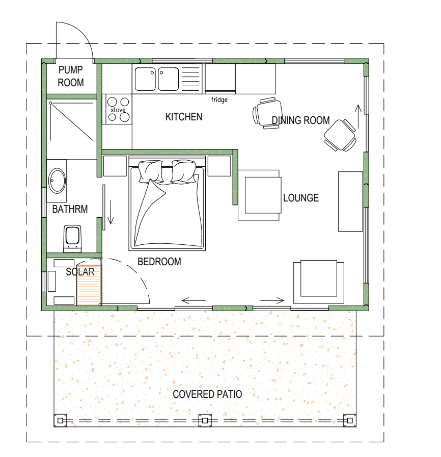 convert this floor plan into a architectural isometric 3d view of a full house show the space from an elevated angle with furniture walls and details visible concrete lodge in south african bushveld setting use the same furniture as shows on the plan do not change the orientation of the floorplan