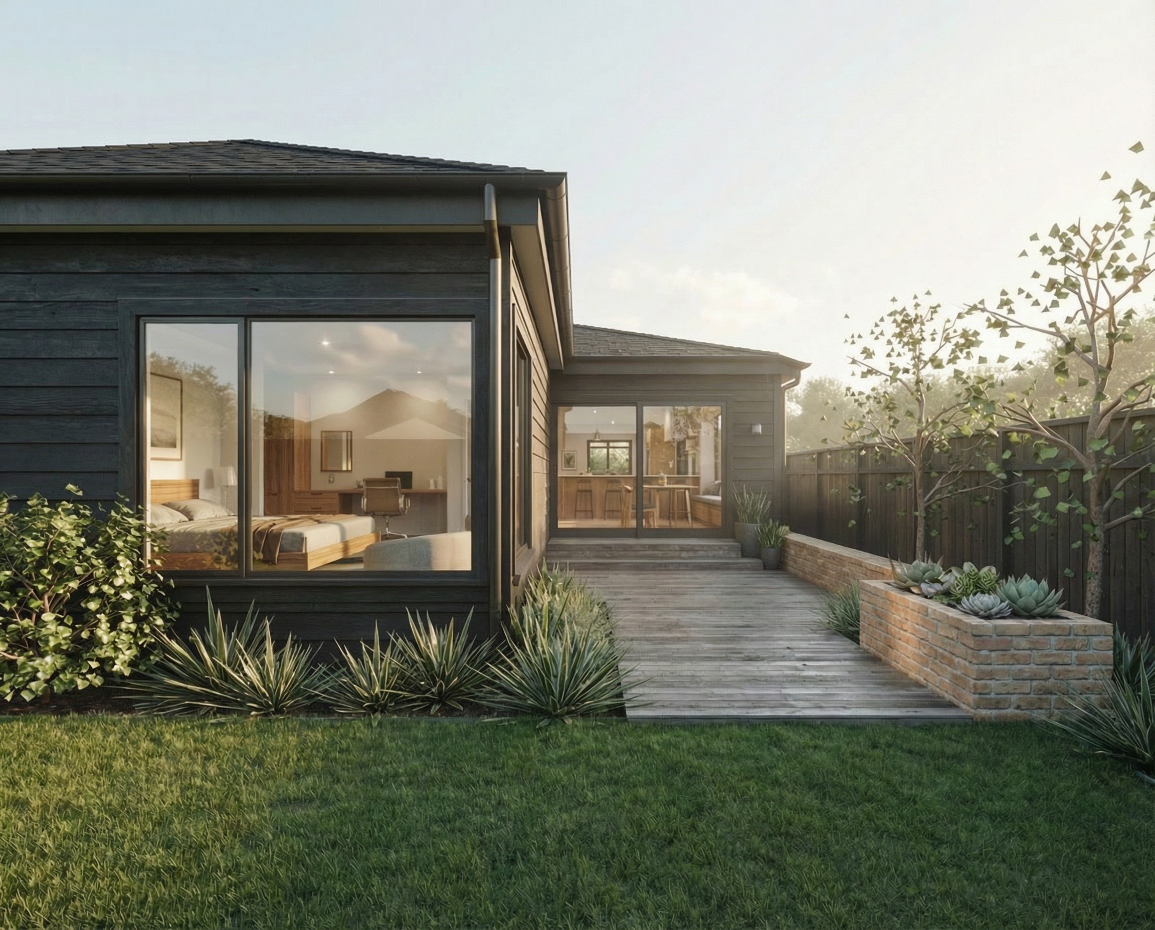 make the black wood siding material smooth and the brick material more contemporary and smooth add two japanese maple trees along the right side of the image where two trees are currently shown make the foreground grass a bit more wild and natural