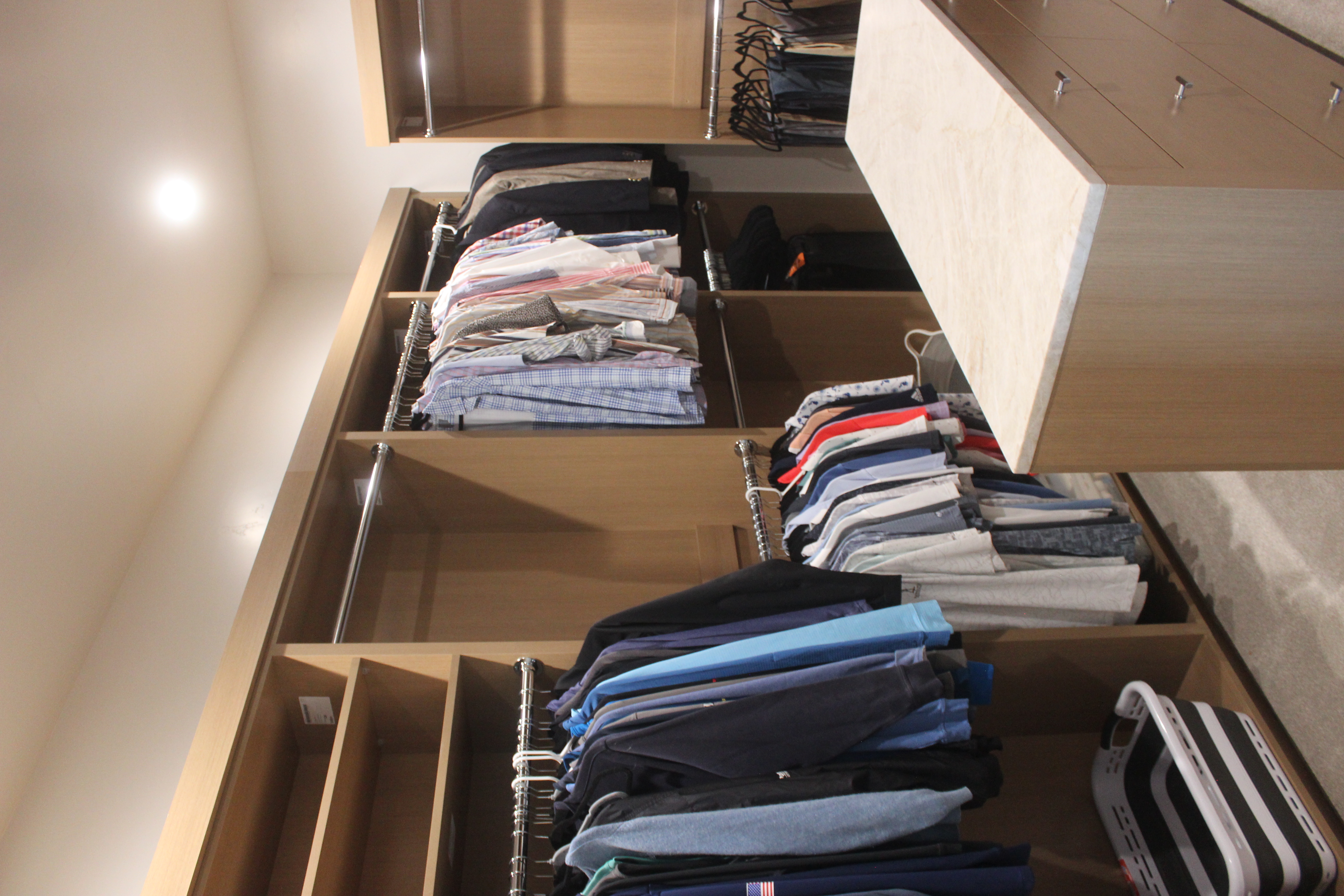 restage all of the clothes so that it looks more modern and elegant add more hanging clothes to the empty closet rods do not change anything about the cabinets add more natural light