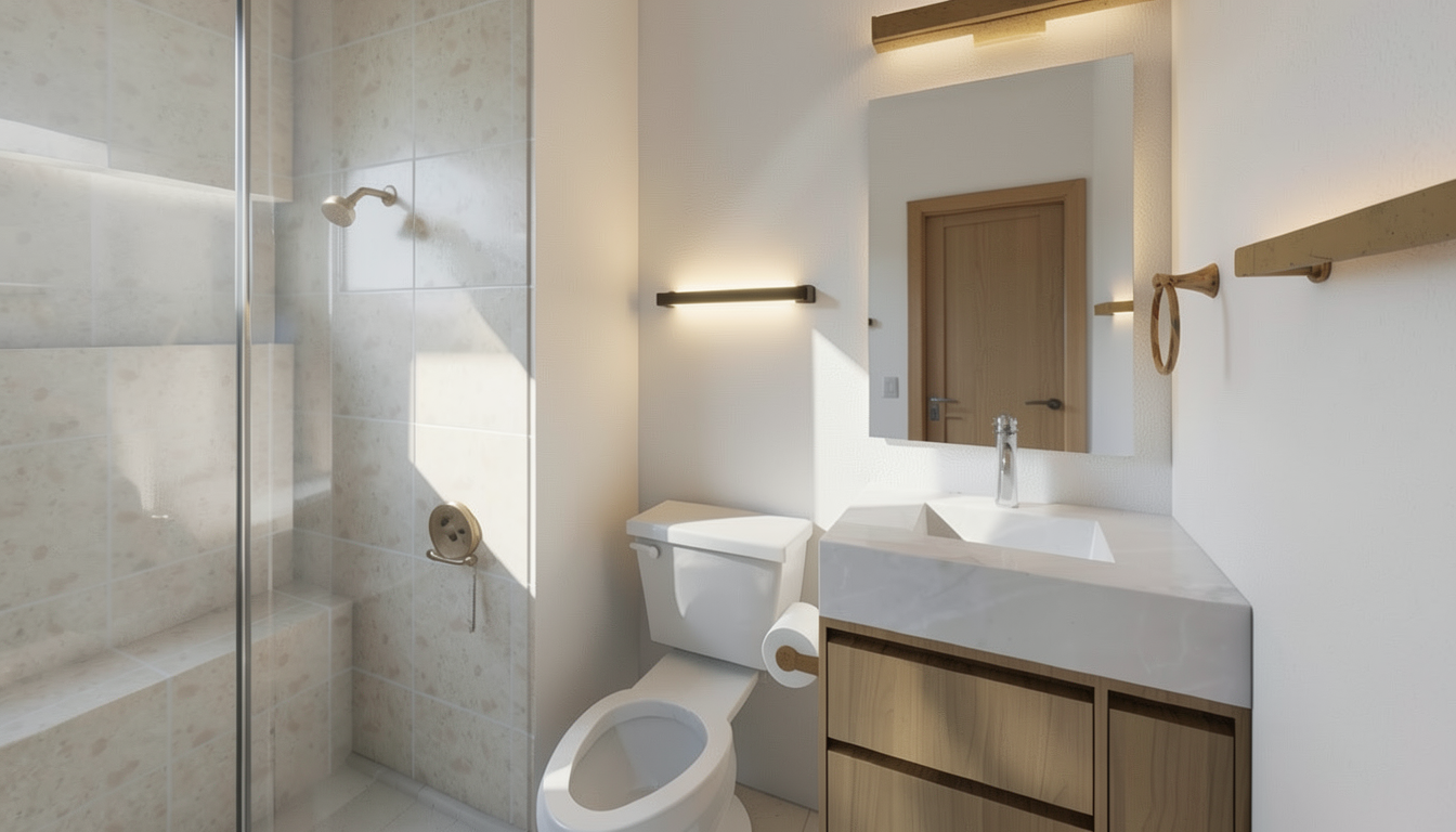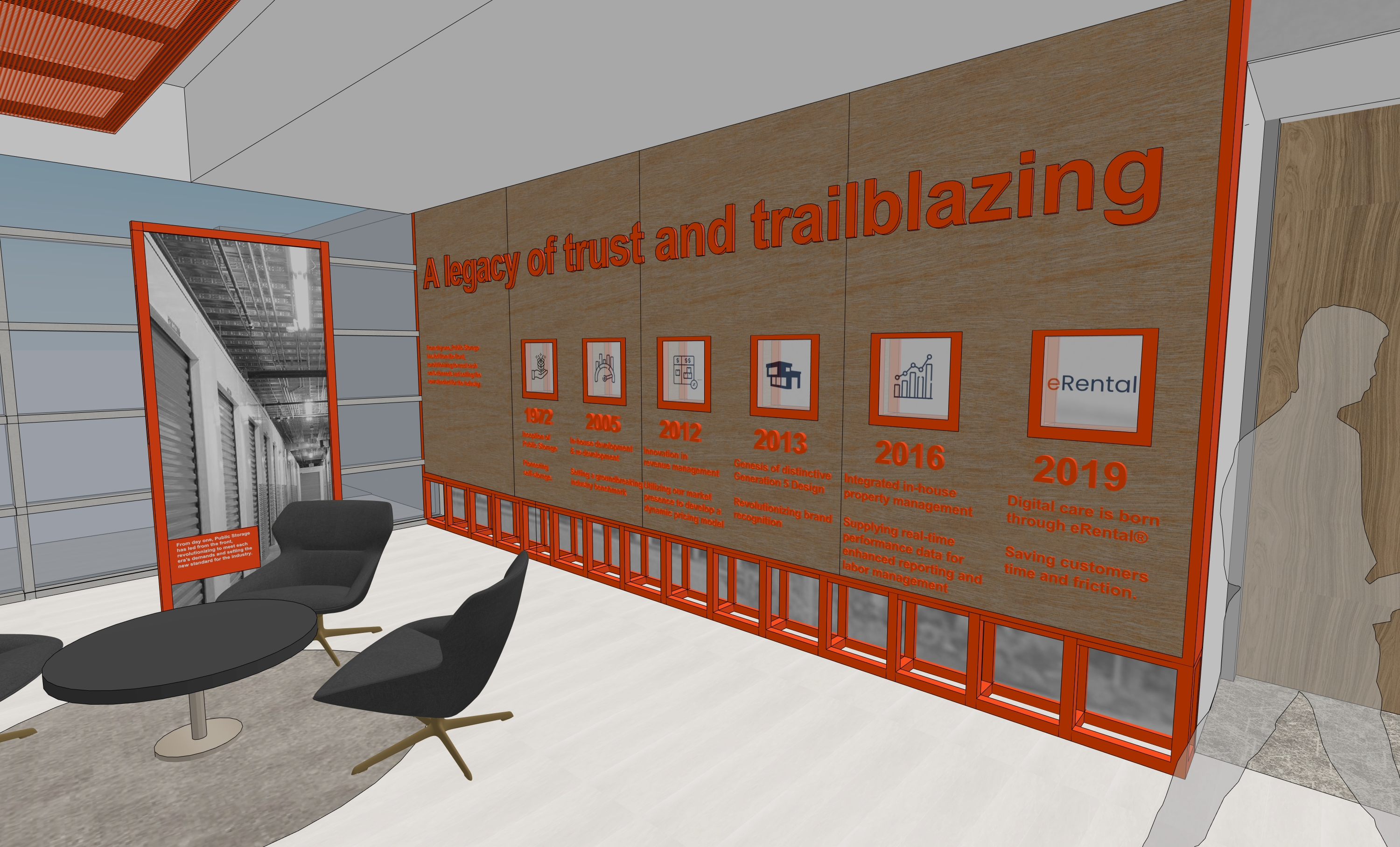 photorealistic interior polished tile floors white walls and light metal orange frames with black and white graphic inside the space is lit up with soft ceiling soft lights wood wall on the right with orange accents and boxes that have a soft glow bright lighting and overall environment is soft bright lighting view outside of clear glass of second story above looking down about 10 feet below aerial of parking lot with trees in the afternoon