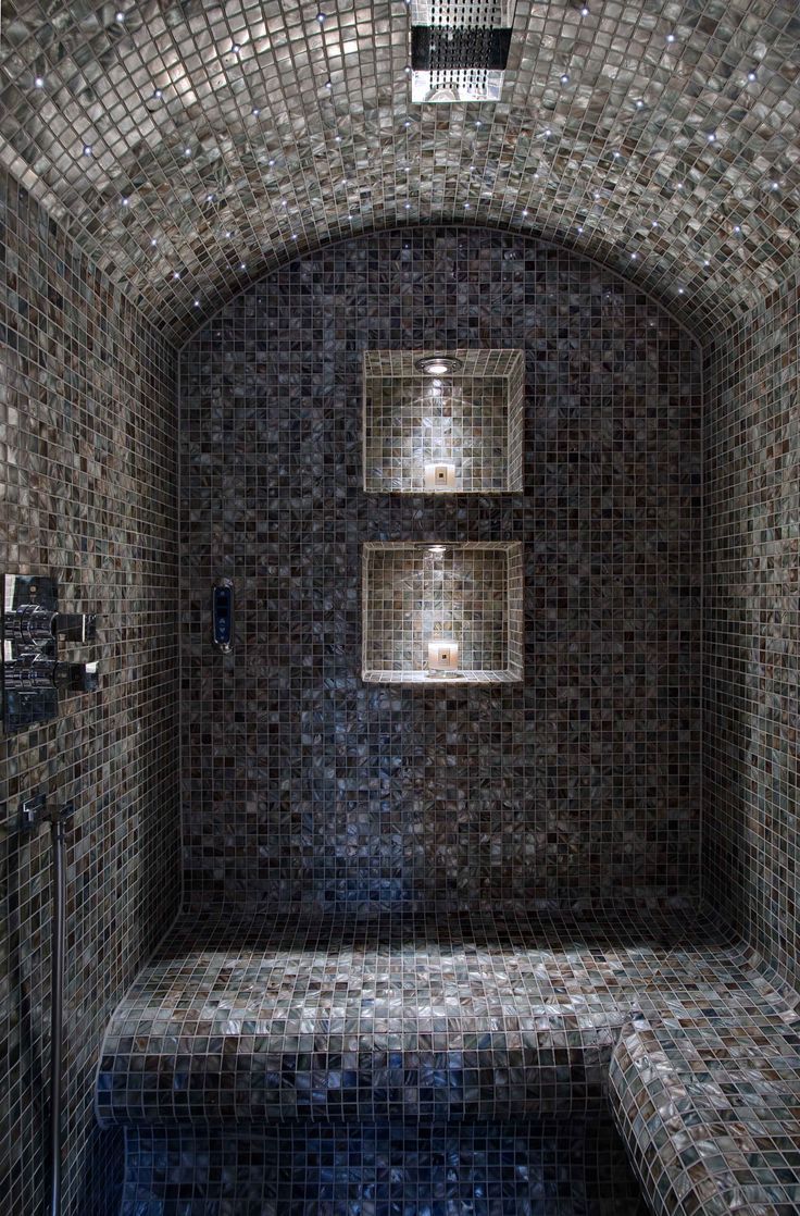 modernist interior shot create a beautifully detailed image of a luxurious mosaic tiled steam room featuring a softly lit arching ceiling use a palette of deep iridescent blues silvers and greys for the tiles creating a shimmering effect the light should cast gentle reflections adding a serene spa like atmosphere incorporate recessed shelves with subtle lighting to enhance the ambiance and a rain showerhead that adds a touch of modern elegance architecture