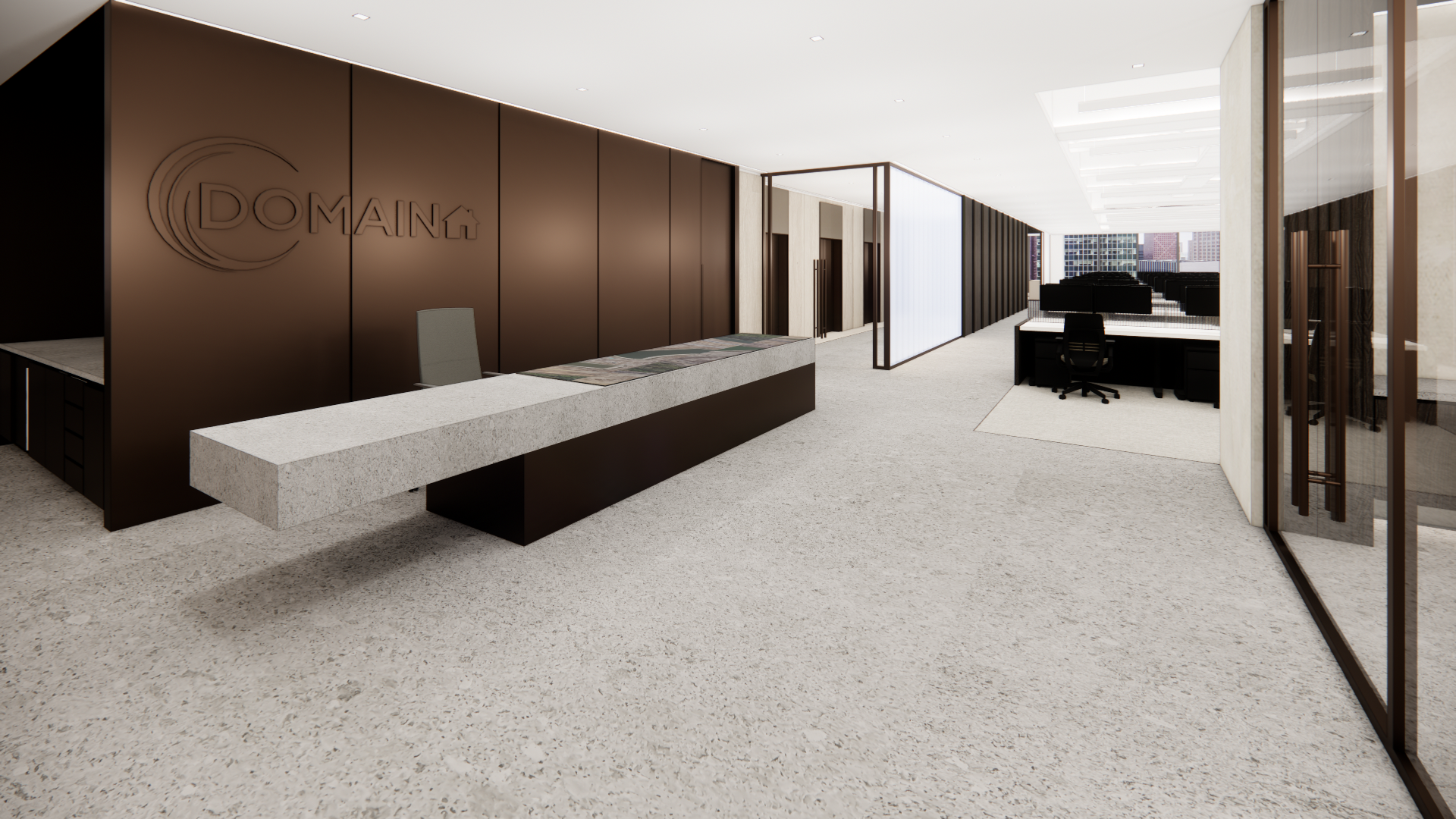 provide a photorealistic rendering keep all the elements proportions and materials as they are provide north daylight through the glass only add linear wall wash illumination at the bronze wall keep the logo as is