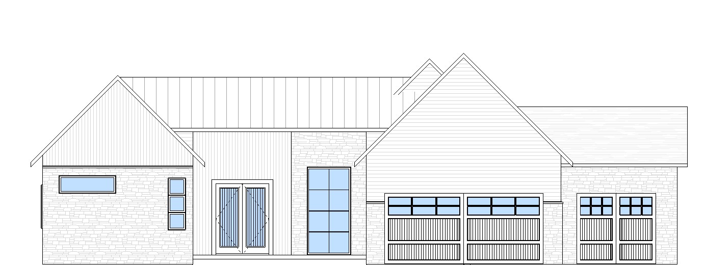 full house view modern scandinavian home with cream and white stone black metal and shingle roofing black frame windows vertical oak wood siding and black garage doors