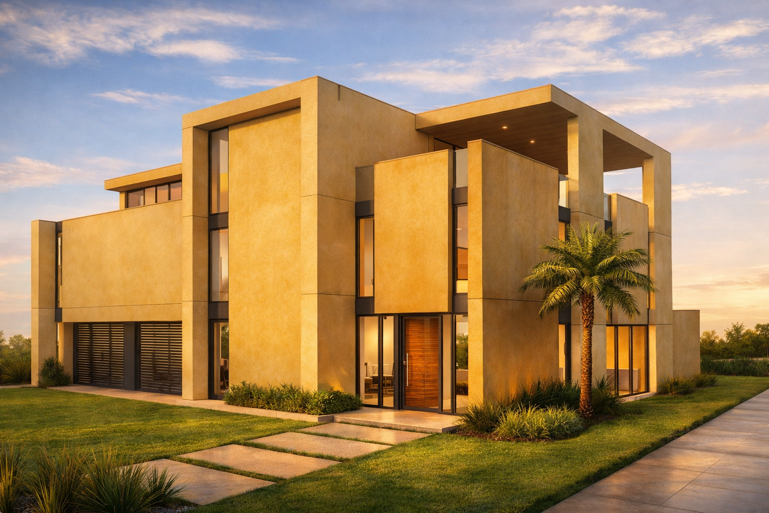 exterior shot use this reference photo for materials but keep all elements and proportions exactly as shown in the project model add in a driveway leading toward the garage doors and a walkway toward the front pivot door located in the central circulation core add a palm tree to the right of the front door