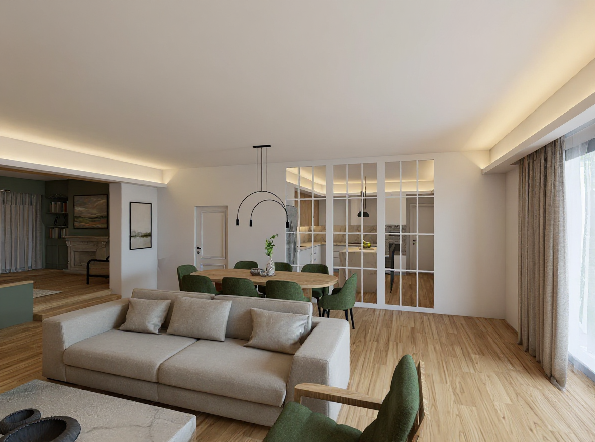 create a cozy modern kitchen and dining area with a minimalist design use a neutral color palette focused on soft taupe and beige walls incorporate dark wood cabinets and open shelves with a subtle grain texture for warmth design a round wooden dining table with green upholstered chairs in sage green for a touch of color include elegant white dinnerware and crystal clear wine glasses on the table add three pendant lights with frosted round shades for ambient lighting feature a large mirror with a wood frame to add depth maintain a light gray ceiling creating an airy atmosphere include a soft beige sofa with a light taupe throw blanket for added comfort and a dark wooden floor to ground the space architecture
