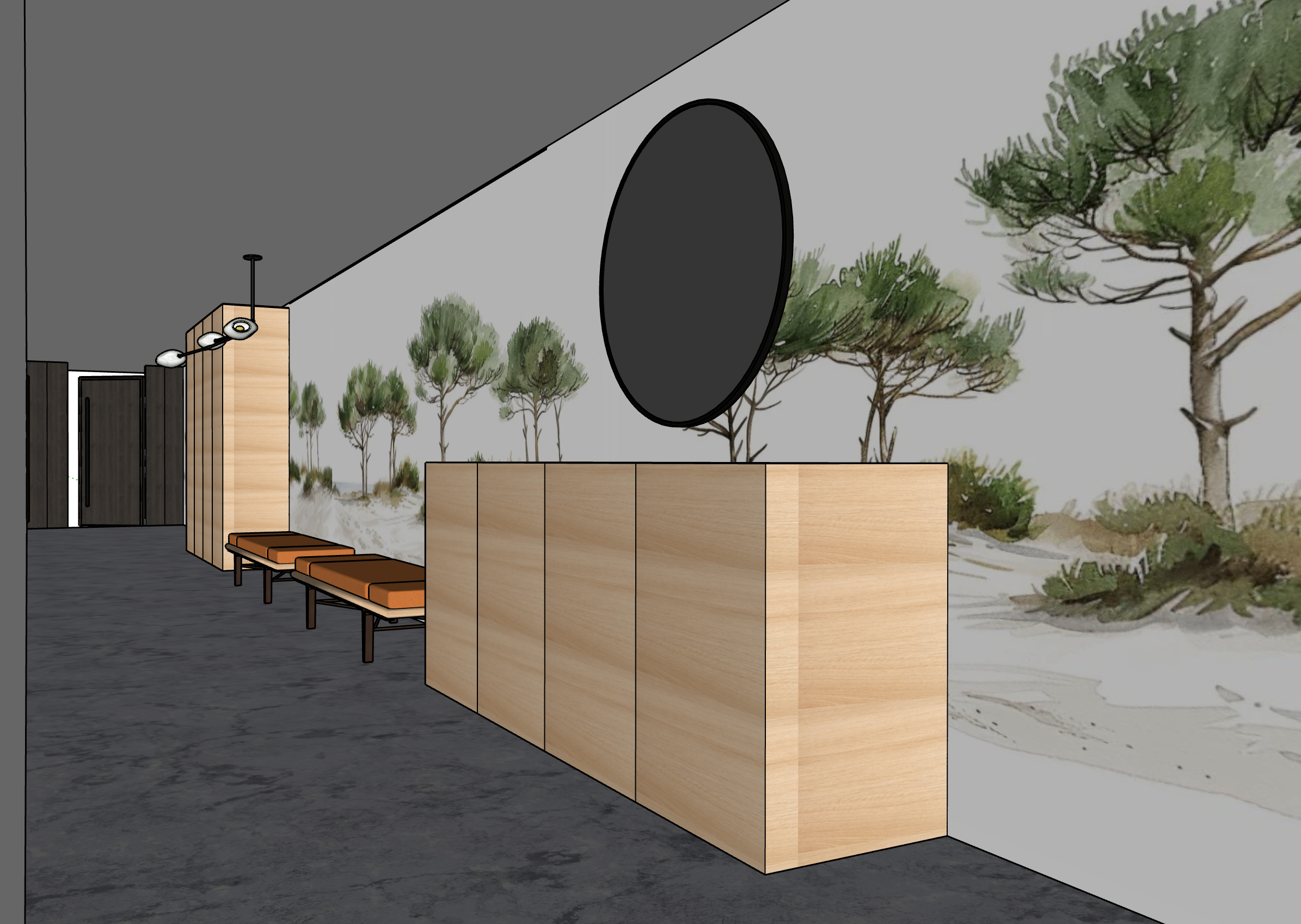 evening with warm lighting green accents grey slate floor change entry door to black change ceiling to a warm cream add floor runner with green accents bench cushions in pale green architecture